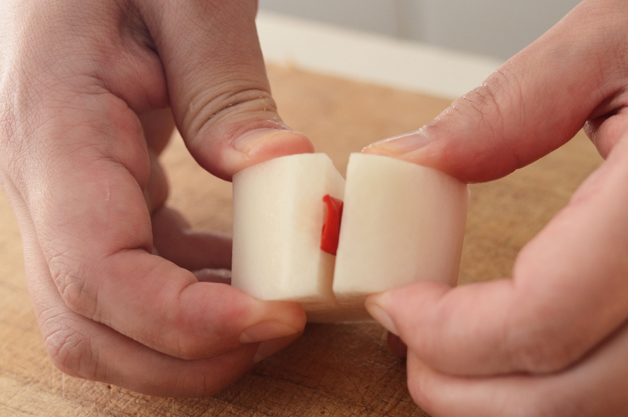 写真のように皮をむいた大根の半分くらいまで包丁で切れ目を入れ、そこに唐辛子を挟んで一緒におろすことでもみじおろしができます。