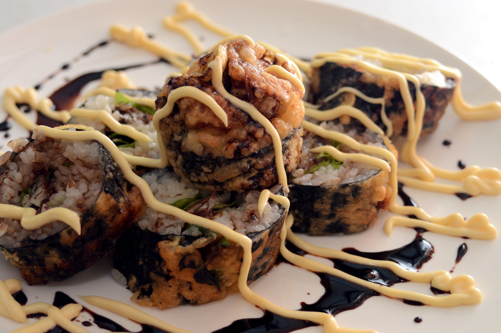 - 揚げた太巻きを食べやすいサイズにカットして皿に盛りつけたら、マヨネーズとバルサミコソースを回しかけて完成。