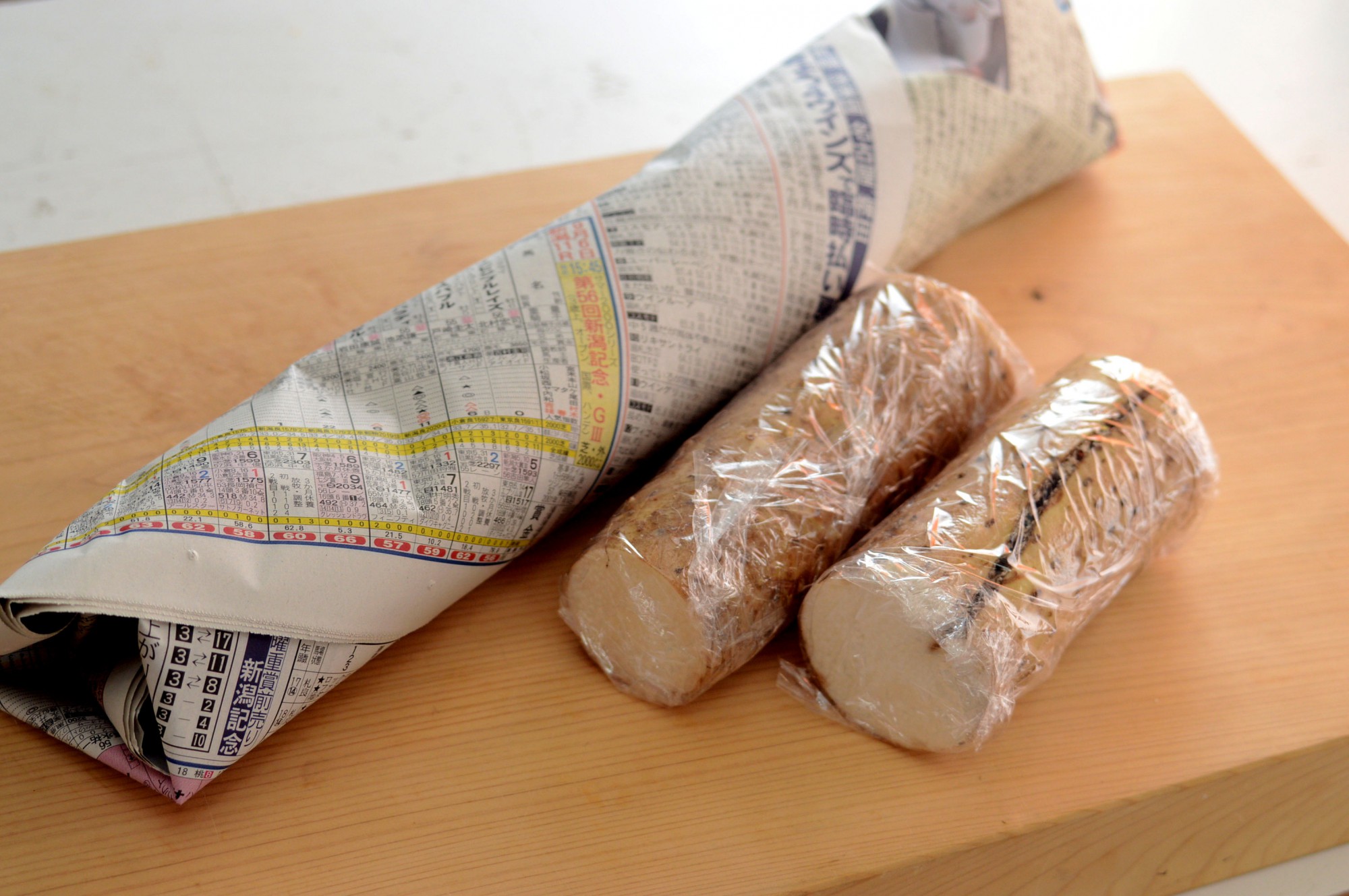 カットしていない丸ごとの山芋は、泥がついたまま新聞紙で包んで冷蔵保存、もしくは直射日光が当たらない冷暗所で保存しましょう。泥を洗い流してしまうと、山芋の風味が早く抜けやすくなります。