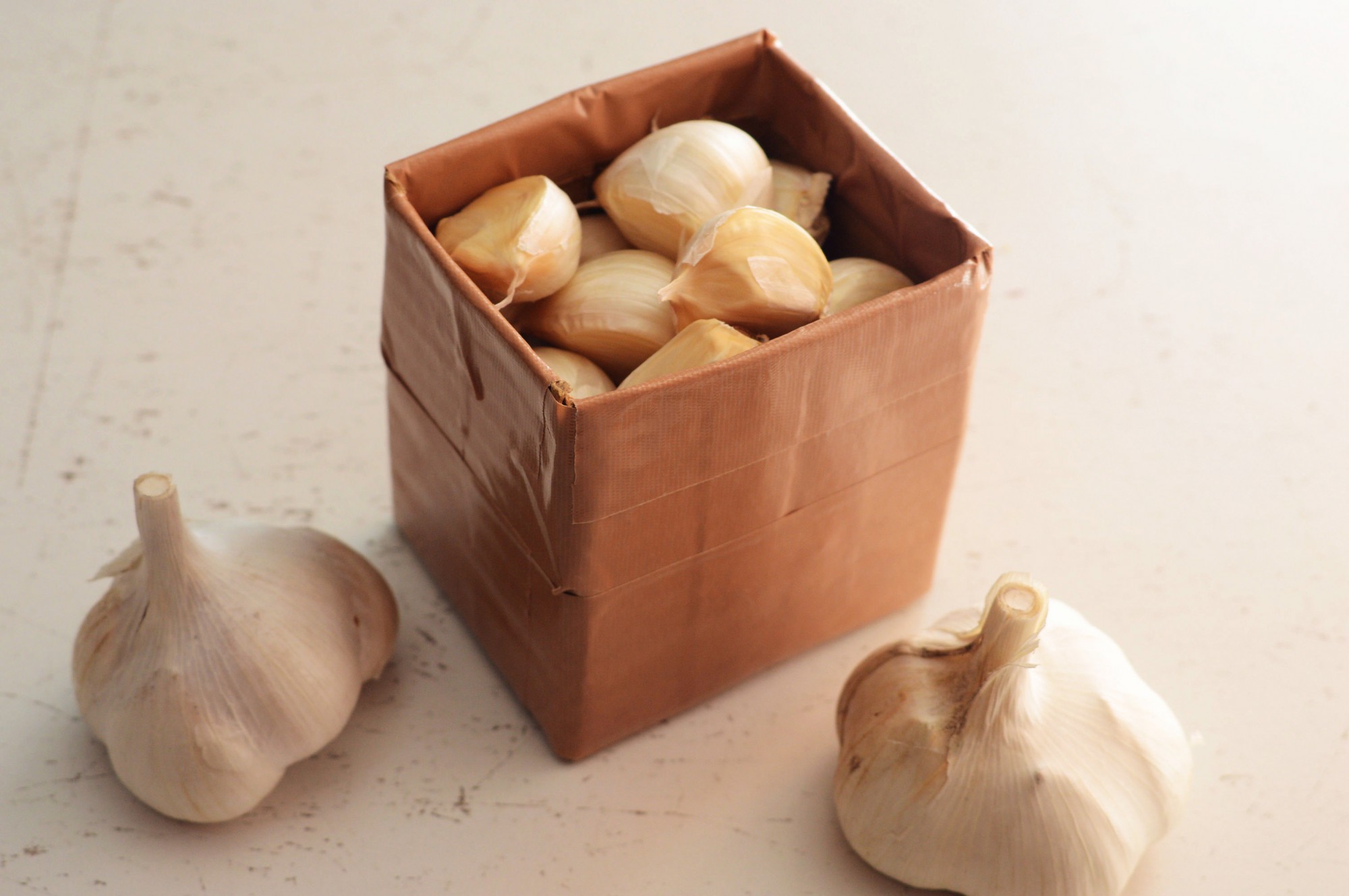 ダンボールで小さな箱を作り、その箱にばらしたにんにくを皮つきのまま入れて野菜室で保存しましょう。