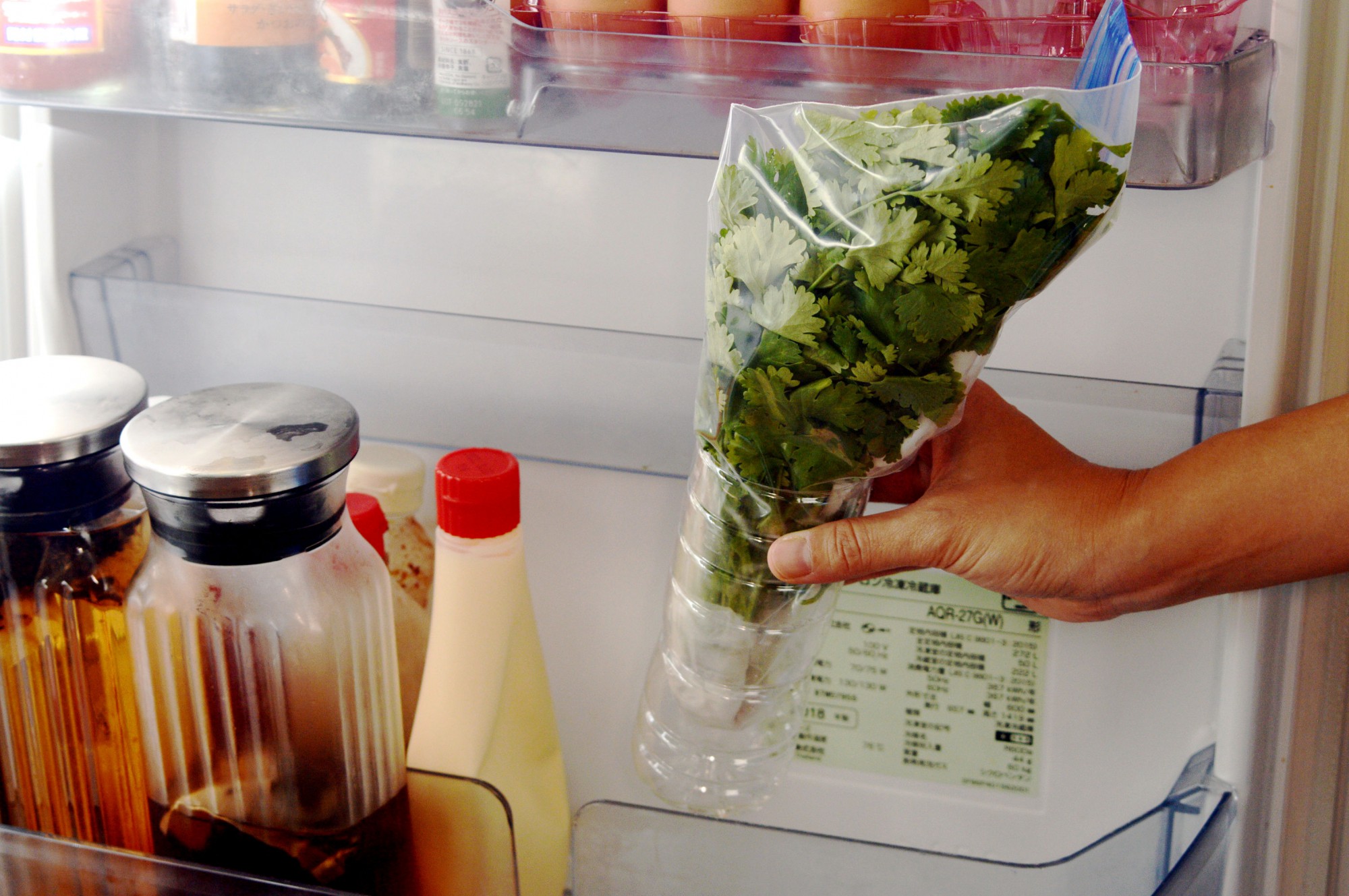 濡らしたキッチンペーパーをパクチーの束の根に巻き付け、頭からポリ袋をかぶせ、ペットボトルの頭を切り取った容器に入れて冷蔵保存しましょう。