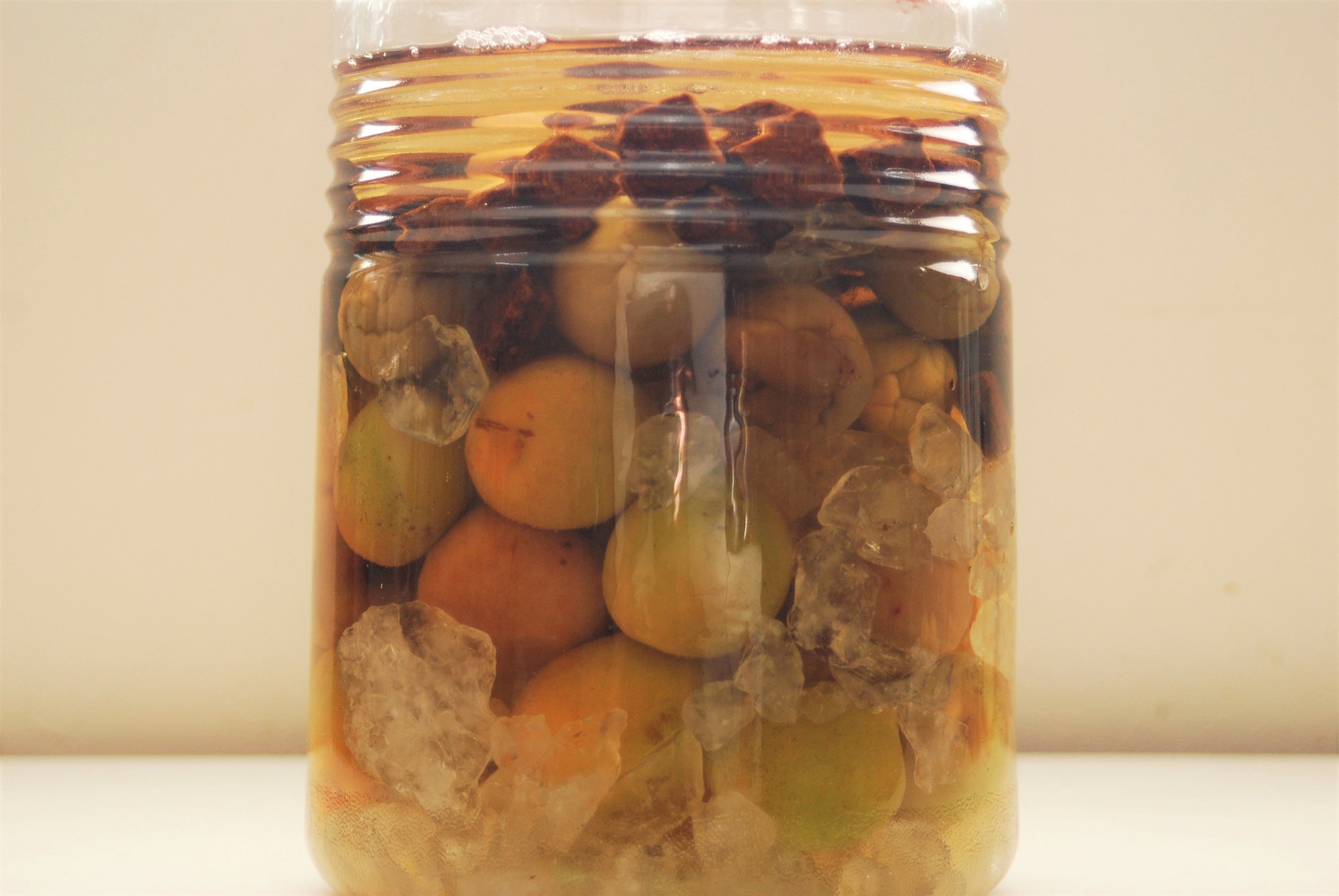 このまま寝かせておくと、梅の香りがじわじわとしみ出し、味もまろやかになっていきます。仕込んでから1年経過したら、中の梅を取り出してください。入れっぱなしだと腐敗しやすいですし、梅の果肉が分解されて濁りの原因になります。