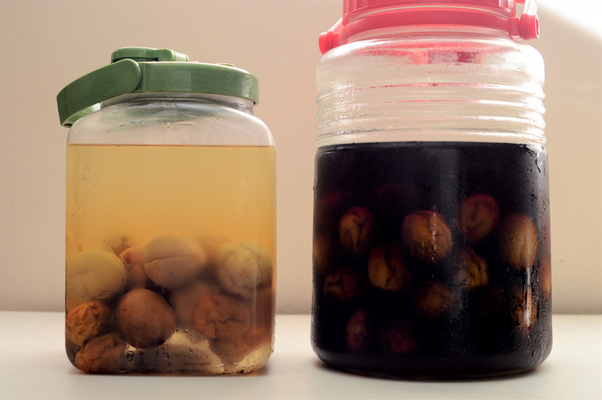 左はホワイトリカーを使った一般的な梅酒です。仕込んだ当初は透明色でしたが、梅の成分がにじみ出て色づき始めています。