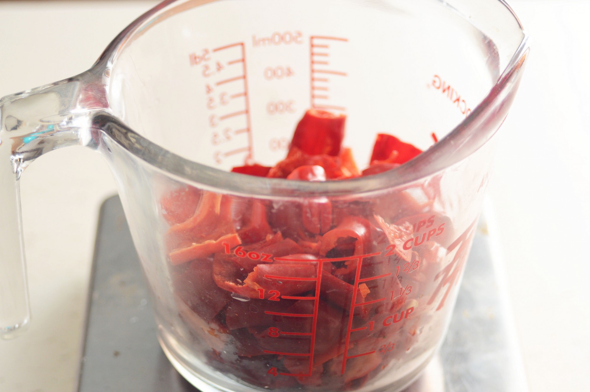 今回は種とヘタを含んだ状態で50gの赤唐辛子を用意しました。使用する塩の量は1g程度。酢は~100ml程度です。
