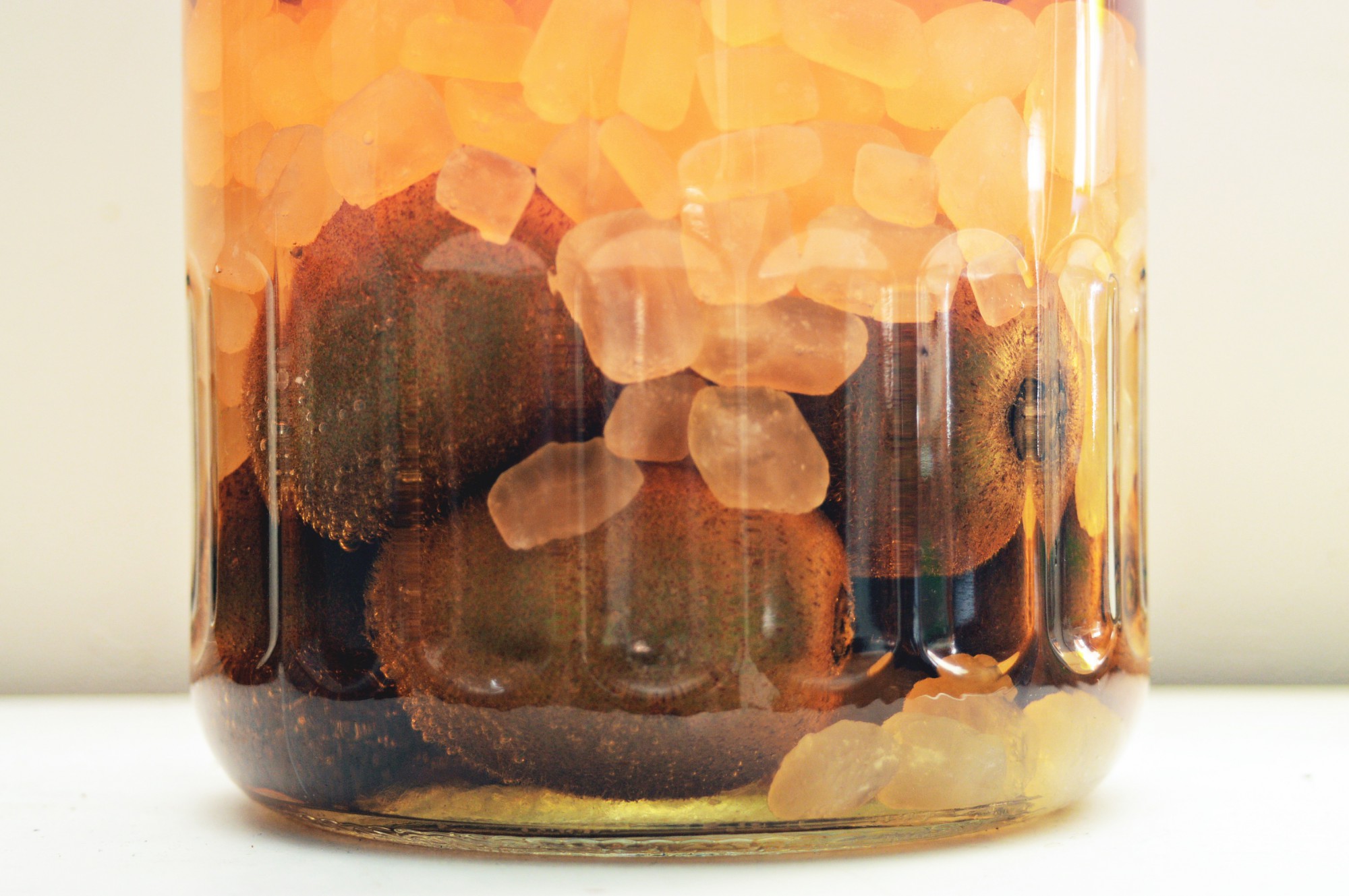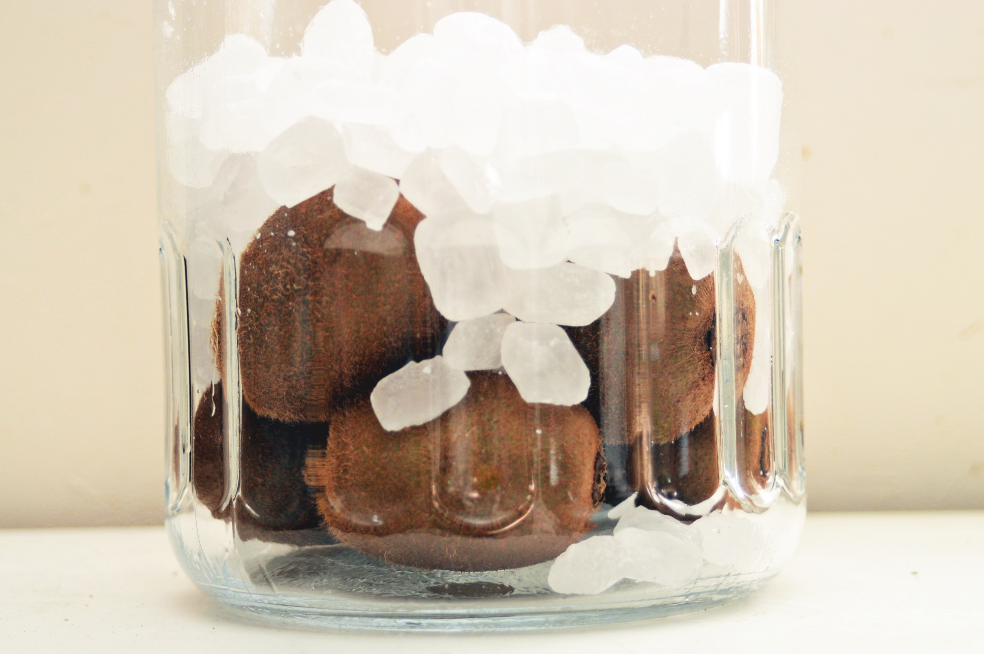 氷砂糖を使うのは、一般的な粉状の砂糖よりも溶けるのが遅いためです。ビンの中で砂糖が溶けると、浸透圧によりフルーツの水分が抜け出てきます。氷砂糖を使うとフルーツから水分が出てくるスピードがゆっくりなので、香りが良いおいしい果実酒になるのです。