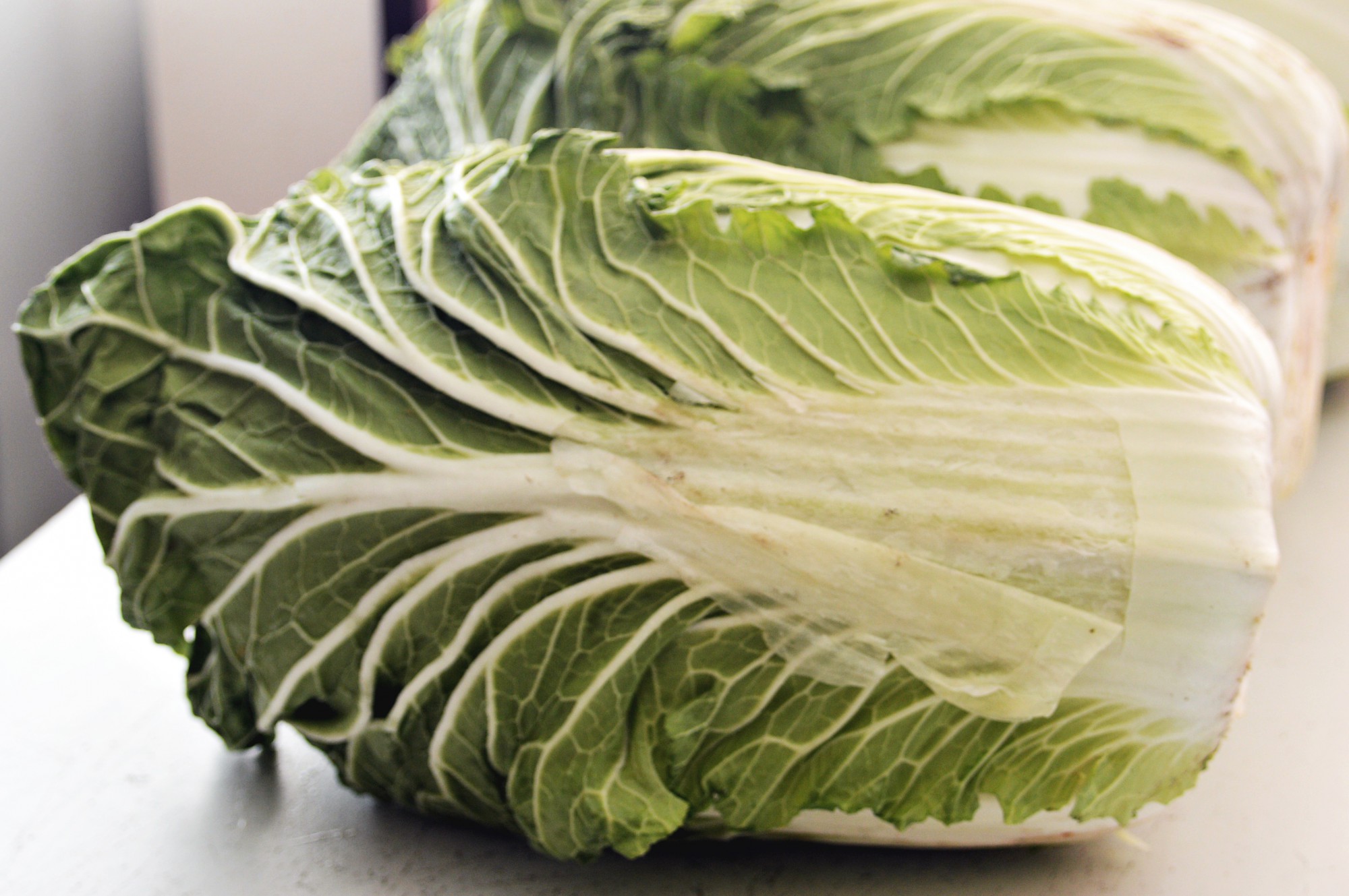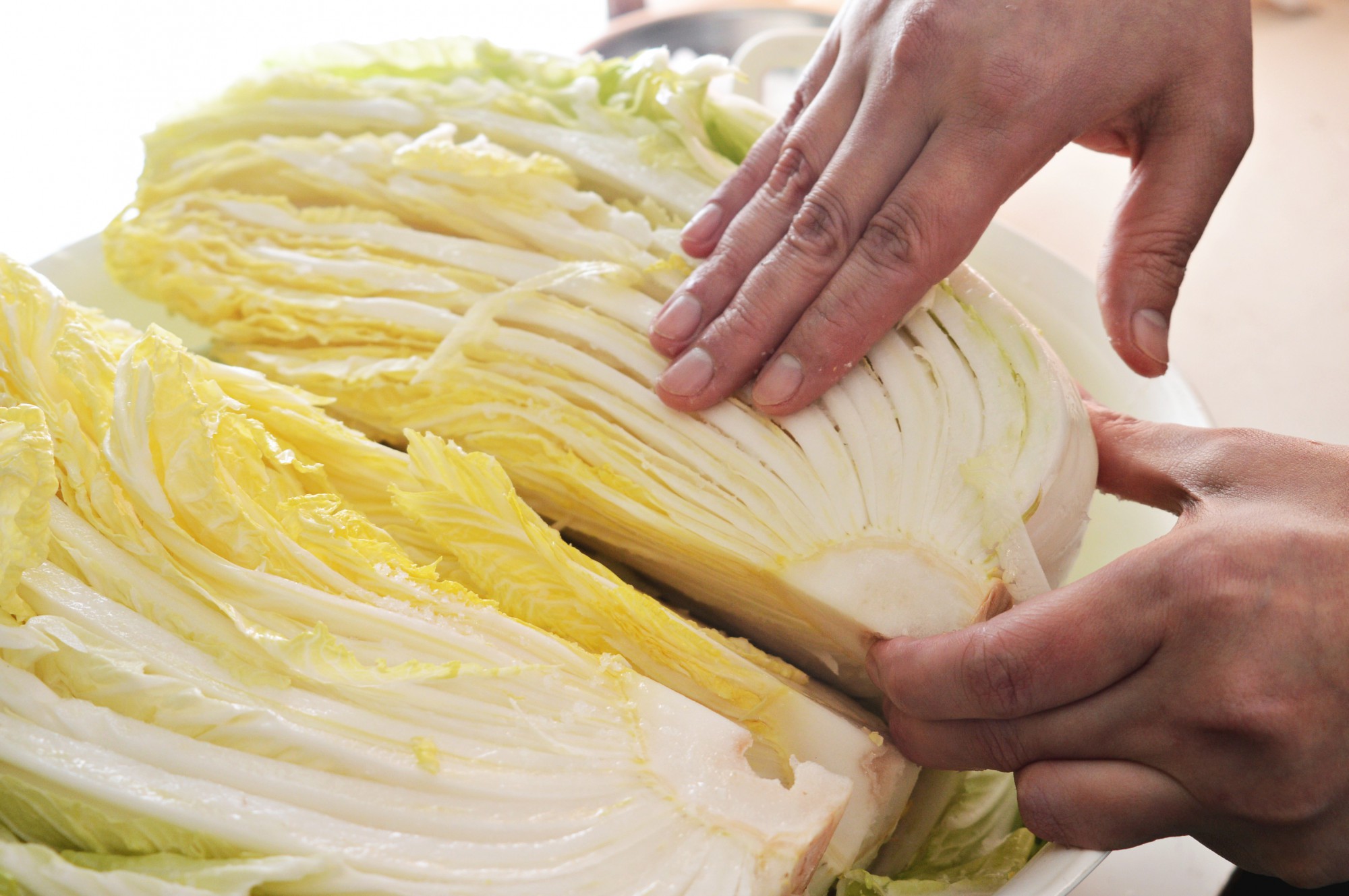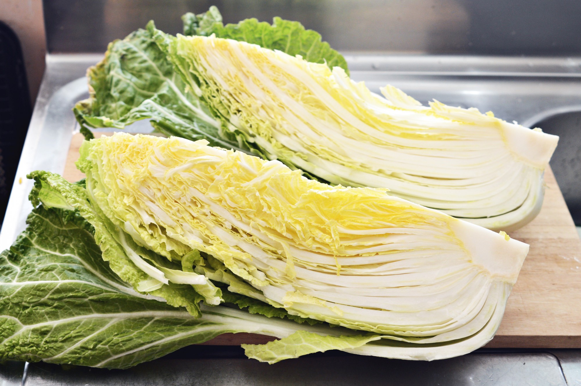 最初にすべての白菜を4等分にカットします。お好みで2等分、8等分にカットしてもかまいませんが、4等分が扱いやすくちょうどいいと思います。