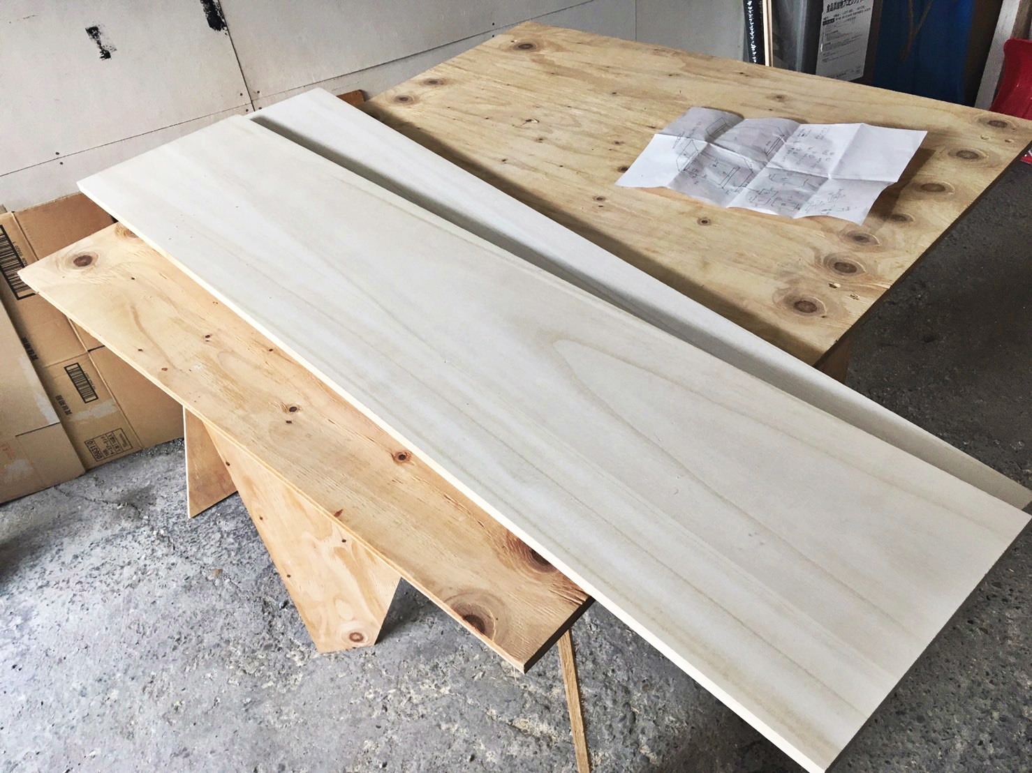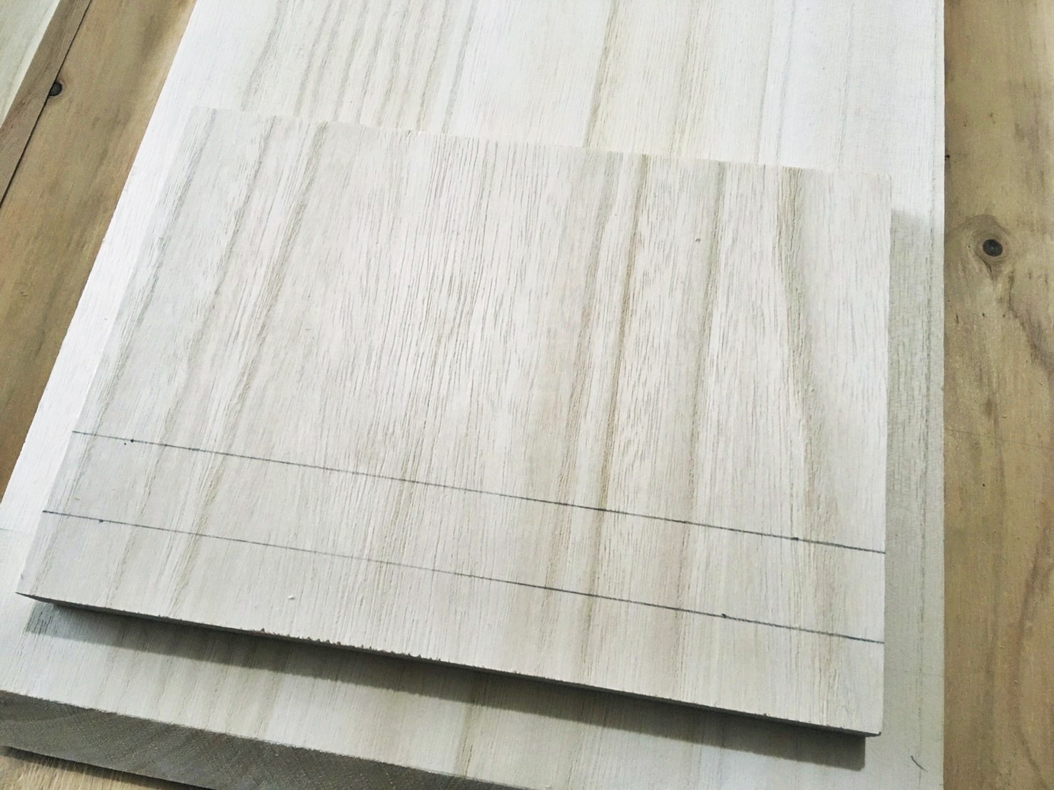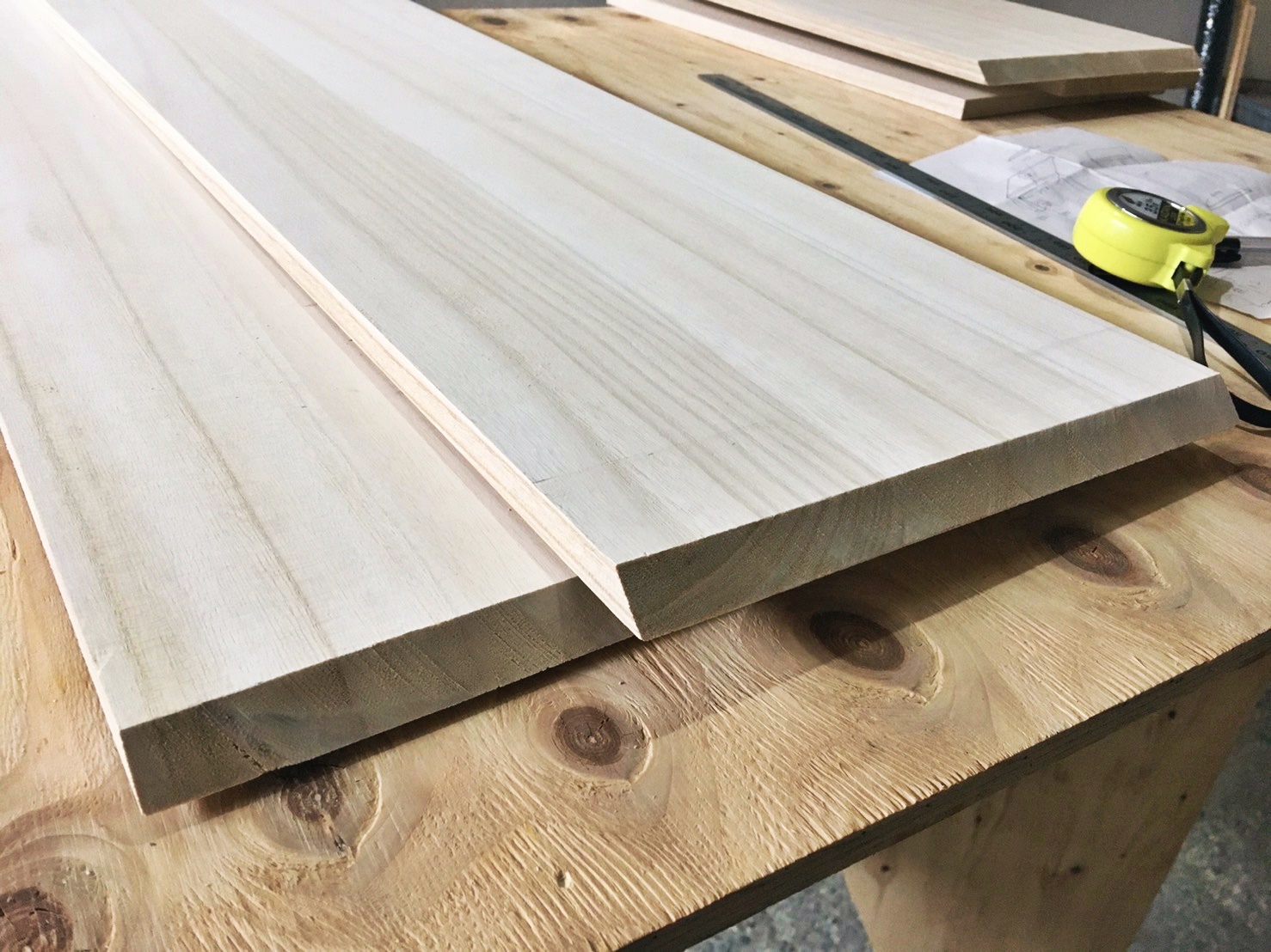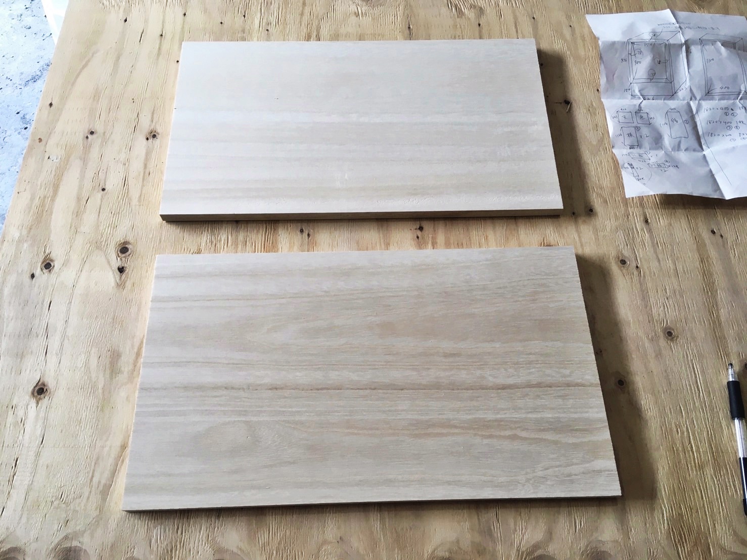 こちらが天板と底板に使う板材です。サイズはどちらも426mm(横)×243mm(縦)×13mm(厚さ)です。