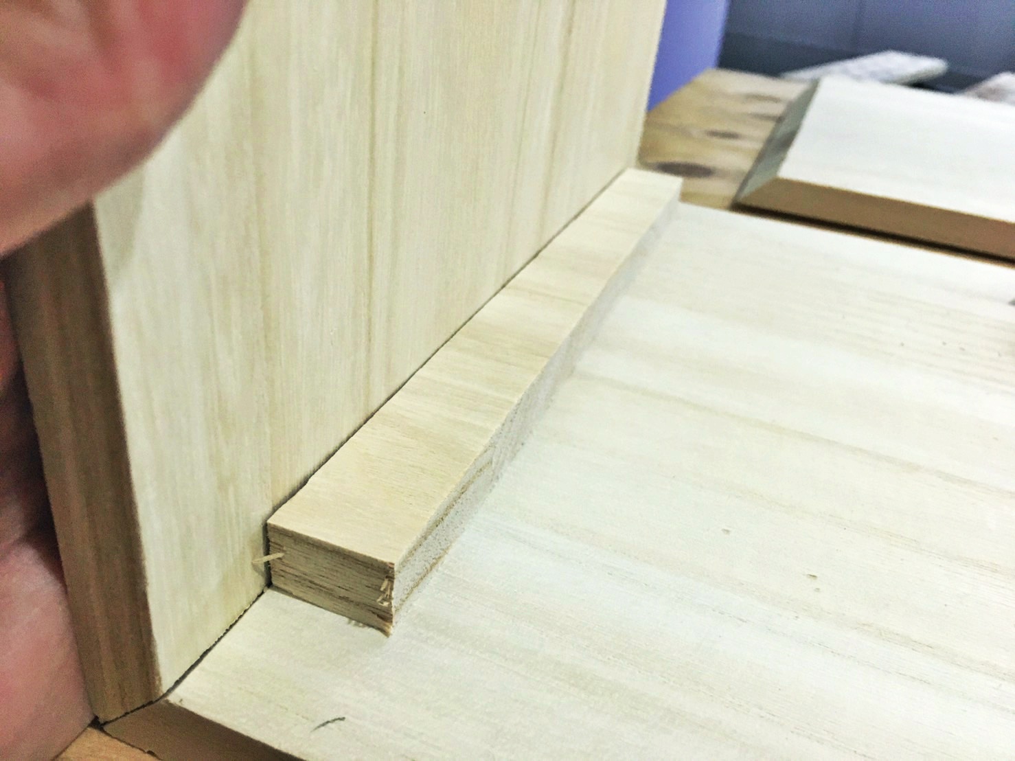 補助材はこの通り、天板と側板の両方に接続するように使います。接着剤だけでは強度が十分ではないので、木ダボも使います。天板側には2ヶ所、側板側には3ヶ所にダボを使えば十分な強度になるでしょう。
