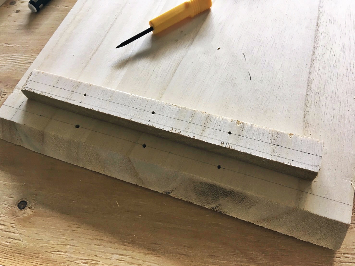 ダボを埋める適当な位置にマーキングします。中央に1ヶ所、中央と端の真ん中に左右それぞれ1ヶ所ずつマークするのがいいでしょう。