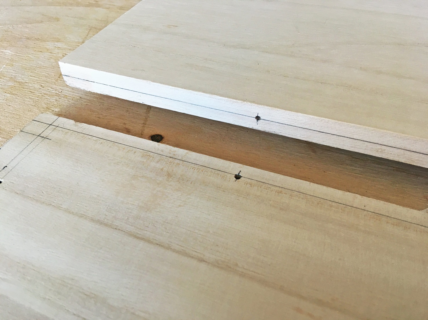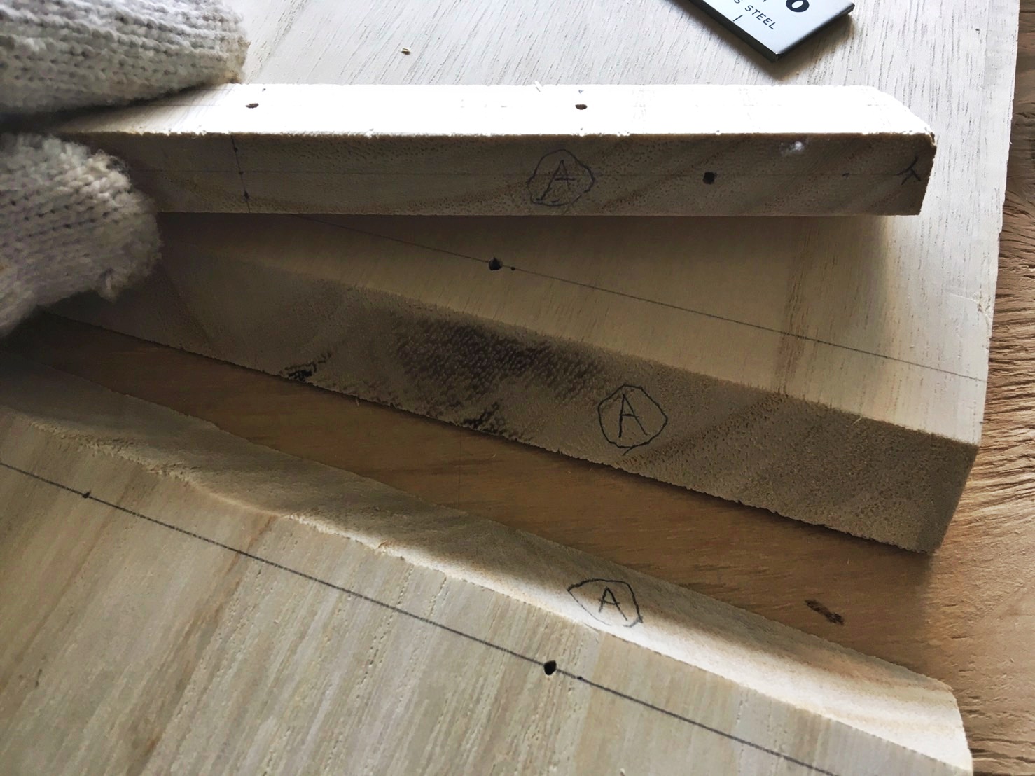 ちなみに、天板と側板、補助材の接続面それぞれにⒶやⒷなどの印をつけておけば、後で「どことどこが接続面だっけ……?」と戸惑わずに済みます。
