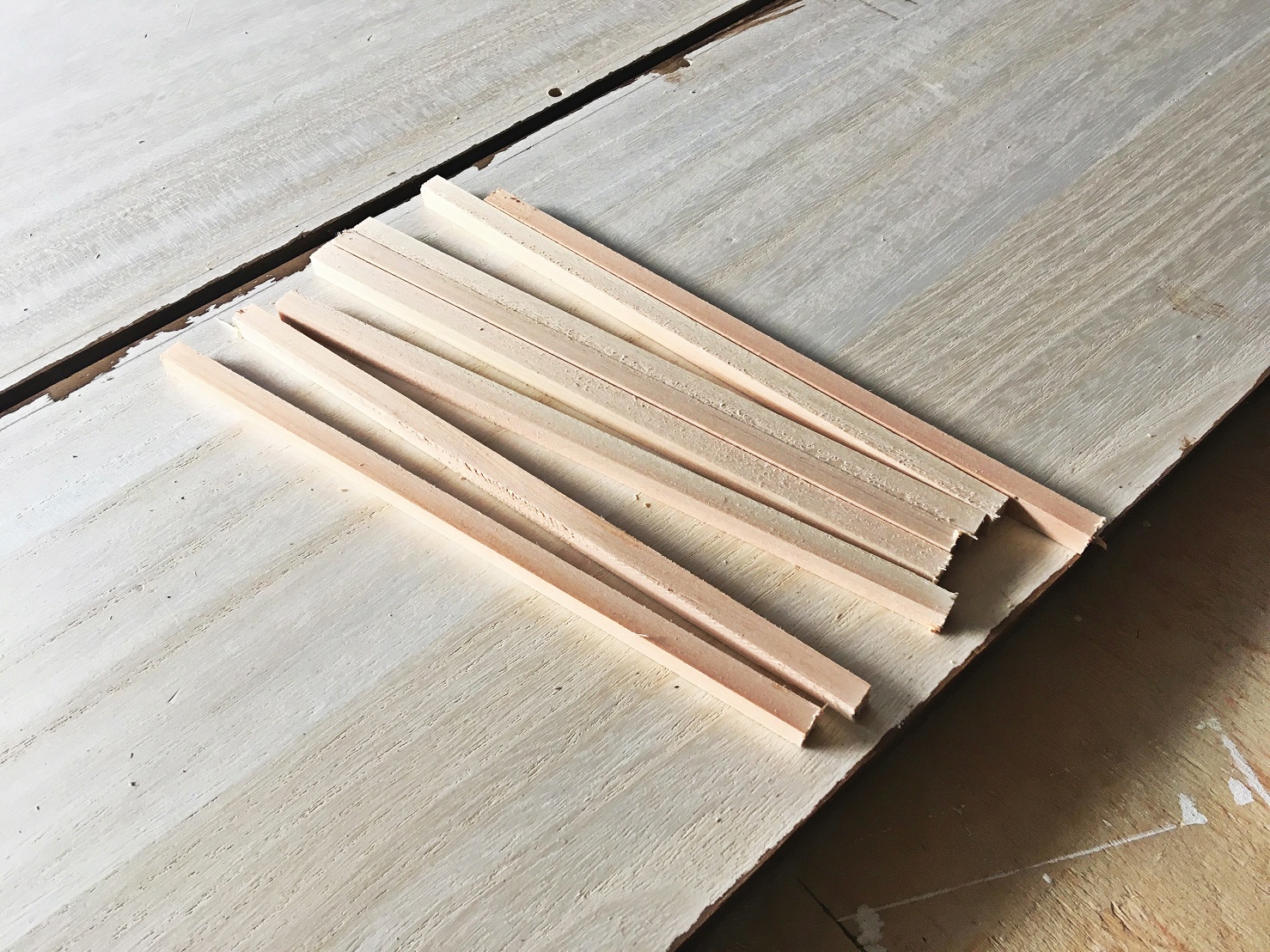 10本の補助材を切り出したら、側板片方につき5本の補助材を貼り付けていきます。