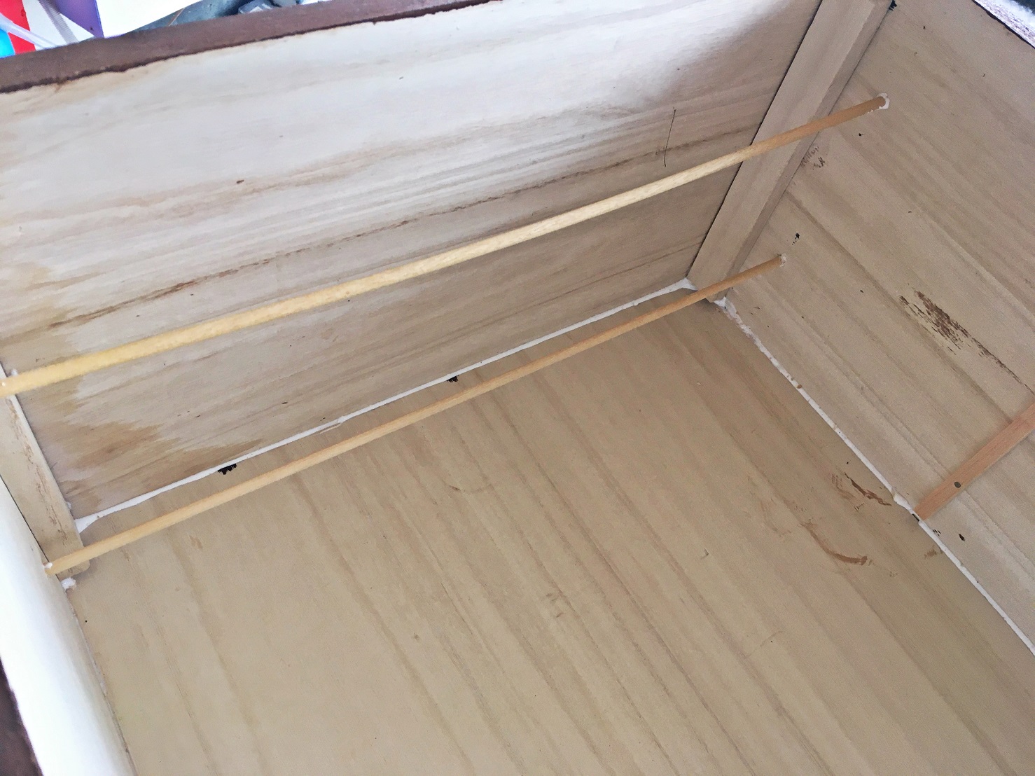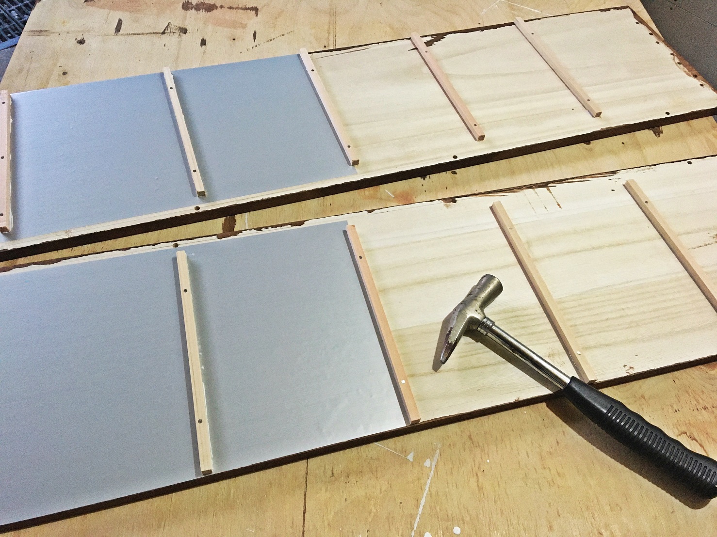 接着剤(木工用ボンド)と釘を使用して補助材を貼り付けました。貼り付ける位置は任意でOKですが、左右の高さを揃えるのを忘れないでくださいね。左右の高さがずれていると、焼き網を水平に設置できなくなってしまいます。