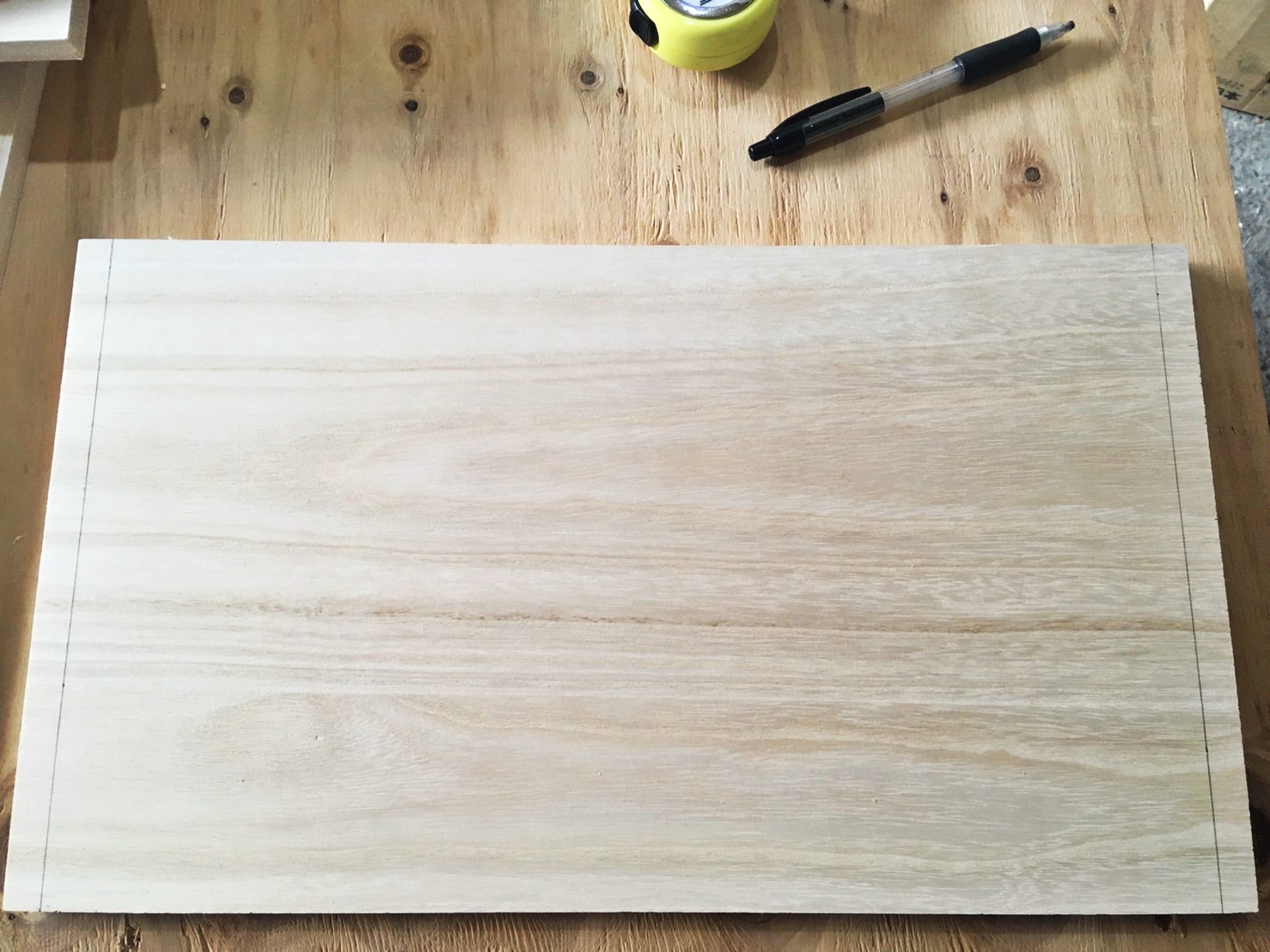 天板と接続する辺を45度に切り落としましょう。まずは板の厚み分(13mm)を測り、鉛筆で線を引きます。
