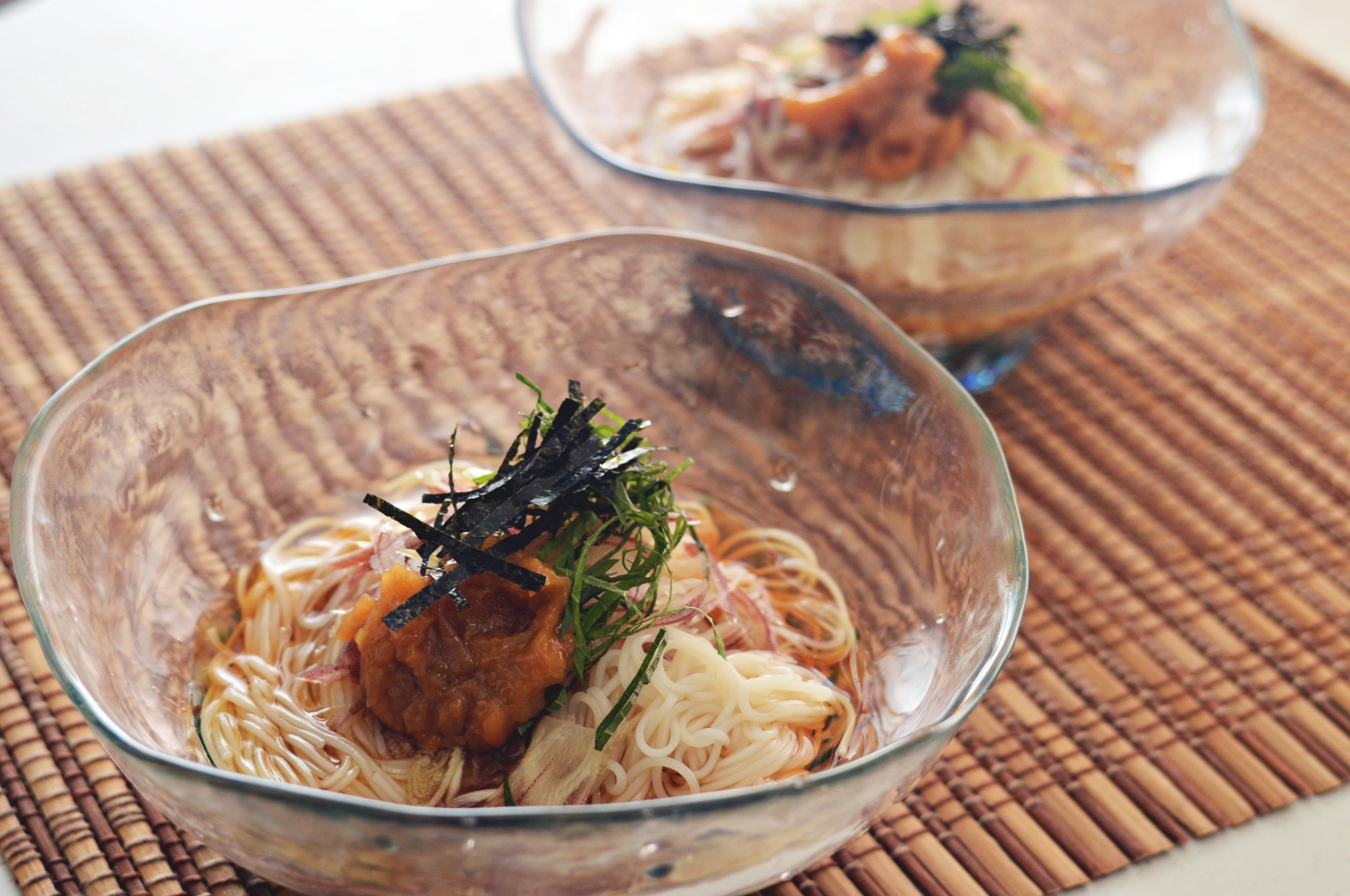 夏らしく梅と大葉、海苔でさっぱりといただく素麺です。簡単に作れる上に、夏バテ予防にもうってつけですよ。