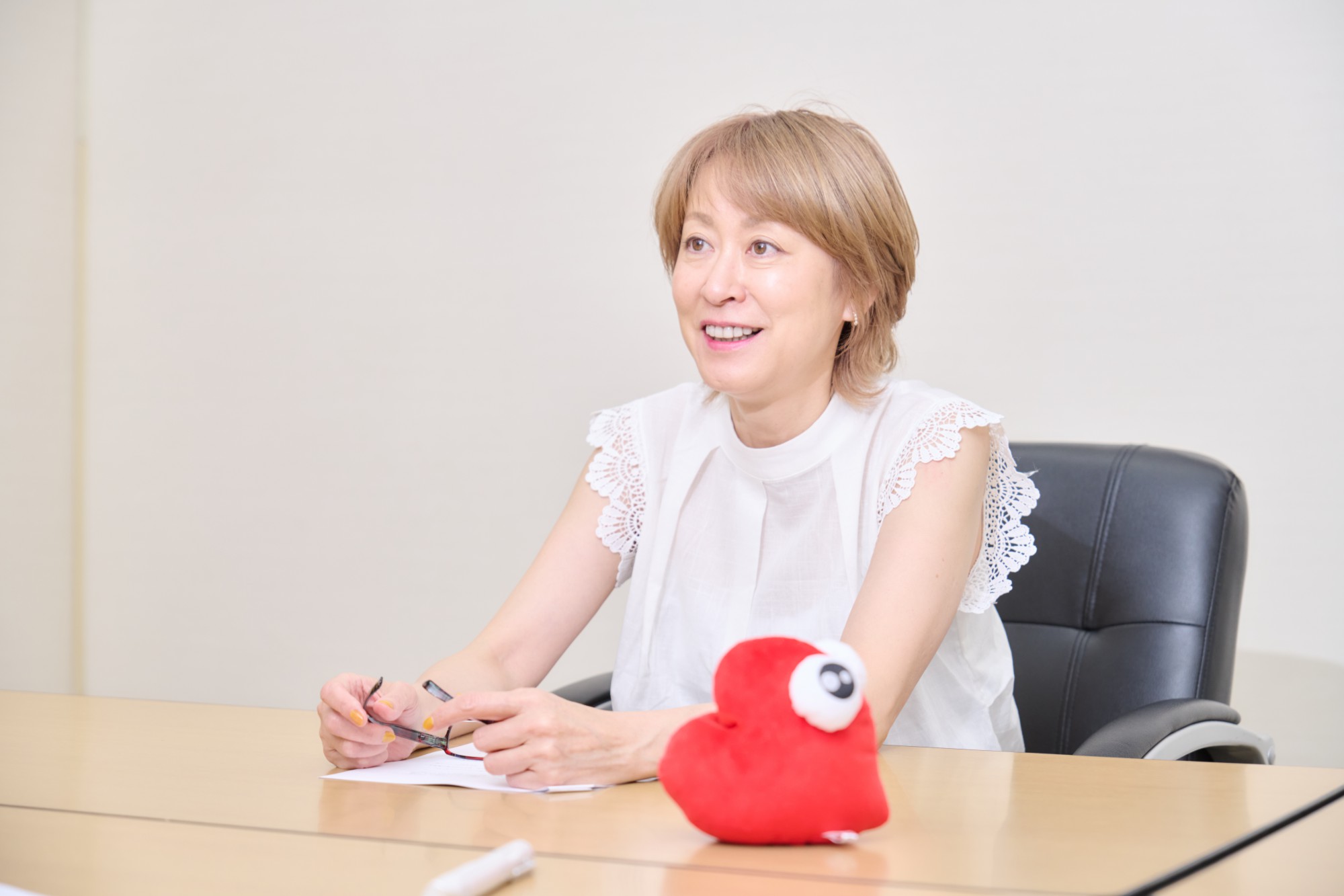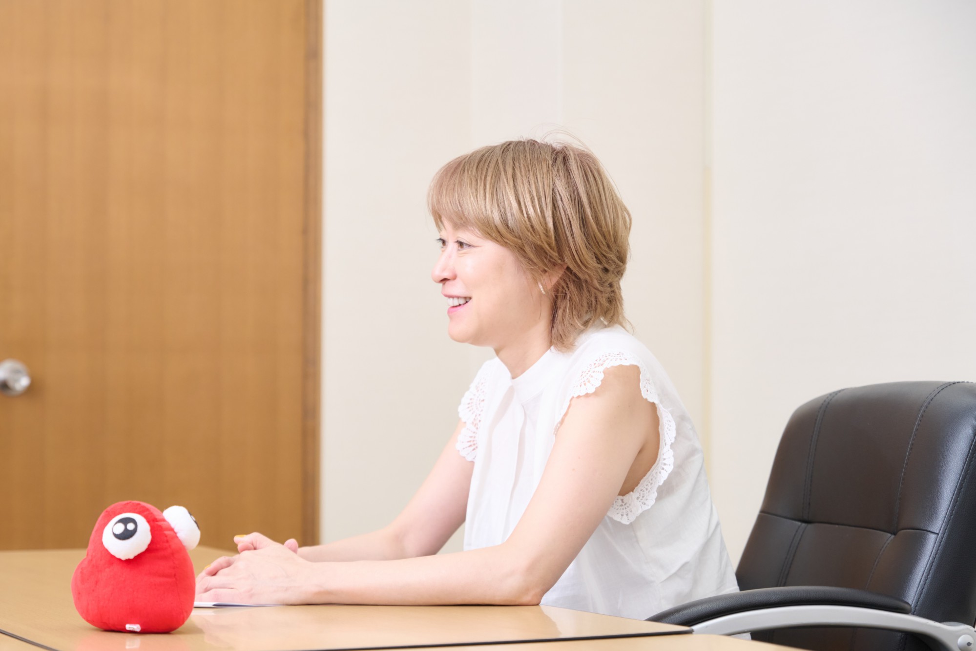 ▲インタビューに答える榊原さんと、「チュバ」のぬいぐるみ