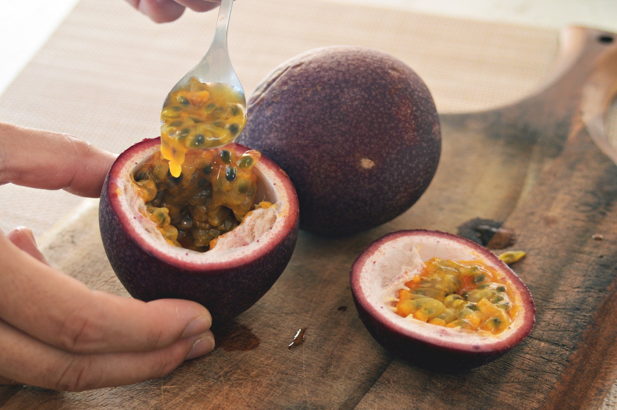 あまりなじみのないフルーツかもしれませんが、適当な位置でカットしてそのまま皮を容器にしてスプーンで食べられるので、実はとてもお手軽なフルーツです。