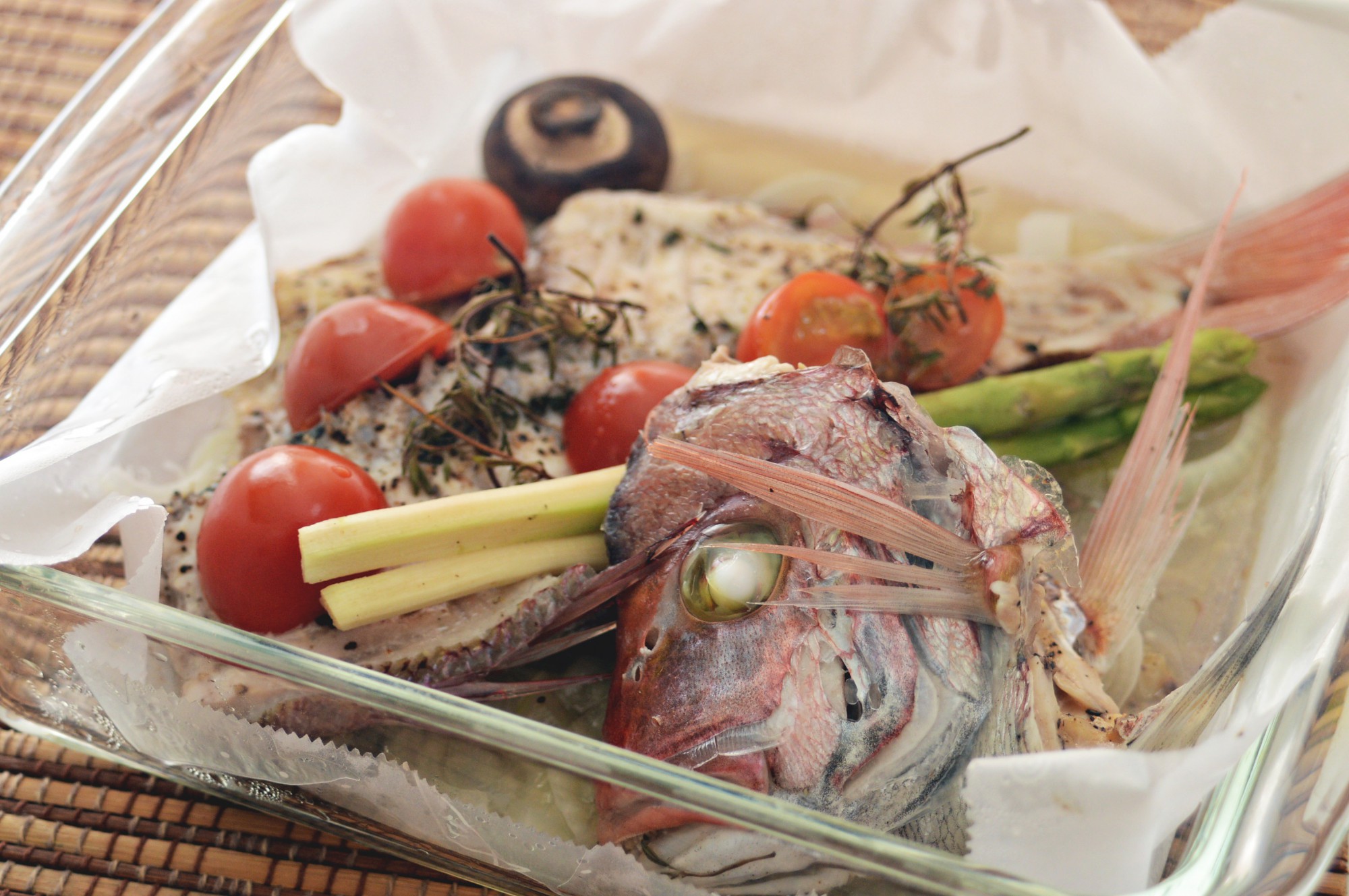 - 耐熱容器の底にスライスした玉ねぎを敷き、その上に魚を乗せる。カットしたミニトマト、マッシュルームを散らし、その上にアスパラガスとタイムを乗せる。