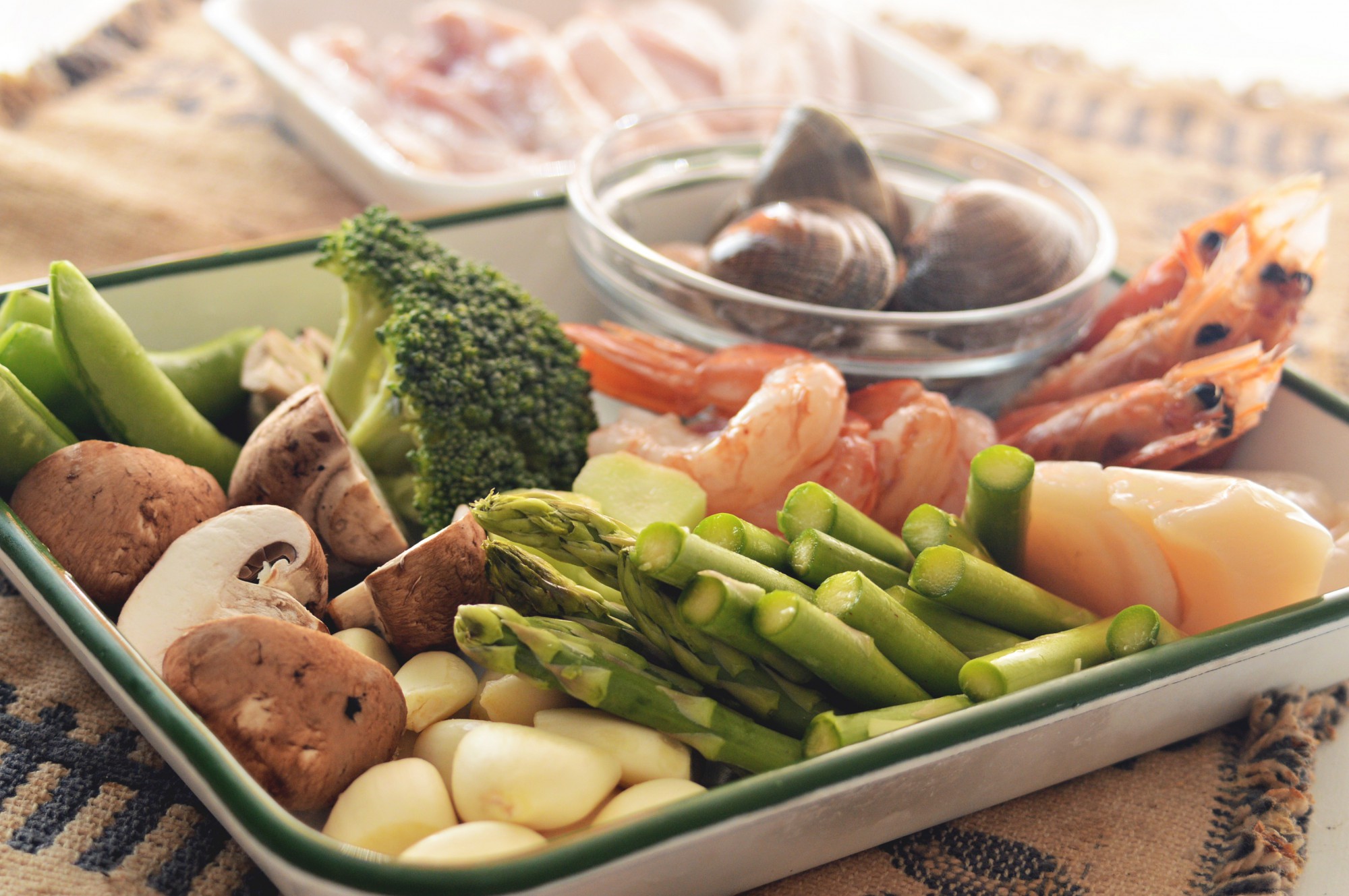 食材はにんにくをベースとして、えびやカキ、エスカルゴ、いわしなどの魚介類から、肉類、野菜類、きのこ類とさまざま。