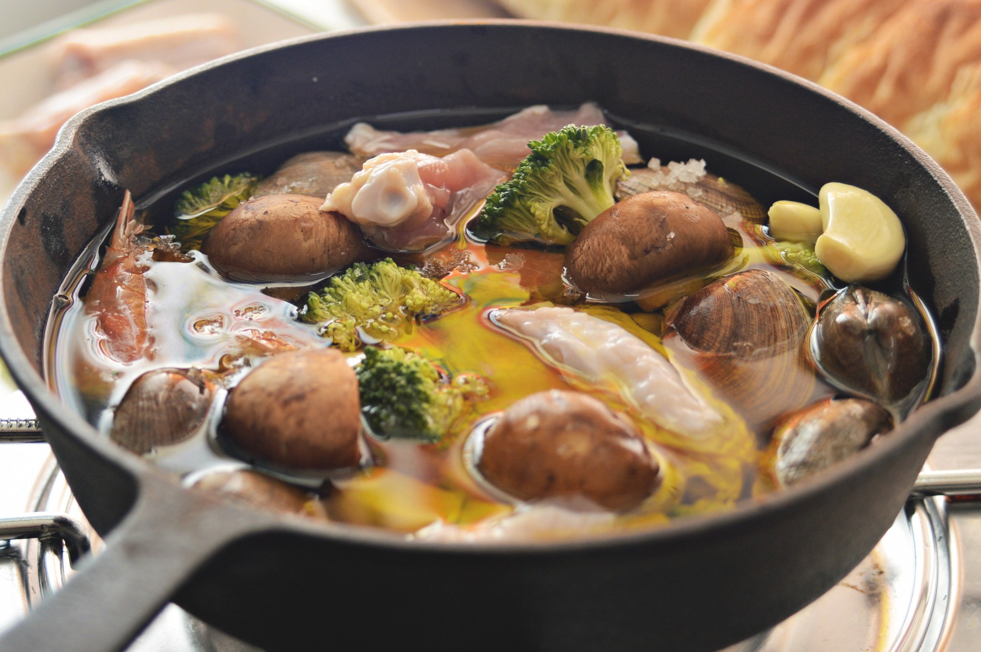 アヒージョの作り方はとても簡単です。スキレットなどの鍋にオリーブオイルを注ぎ入れ、皮をむいたにんにくを入れて弱~中火でじっくり加熱したら準備完了。あとはお好きな食材をオイルで煮てそのまま食べたり、焼いたバゲットと一緒に食べたりするだけです。