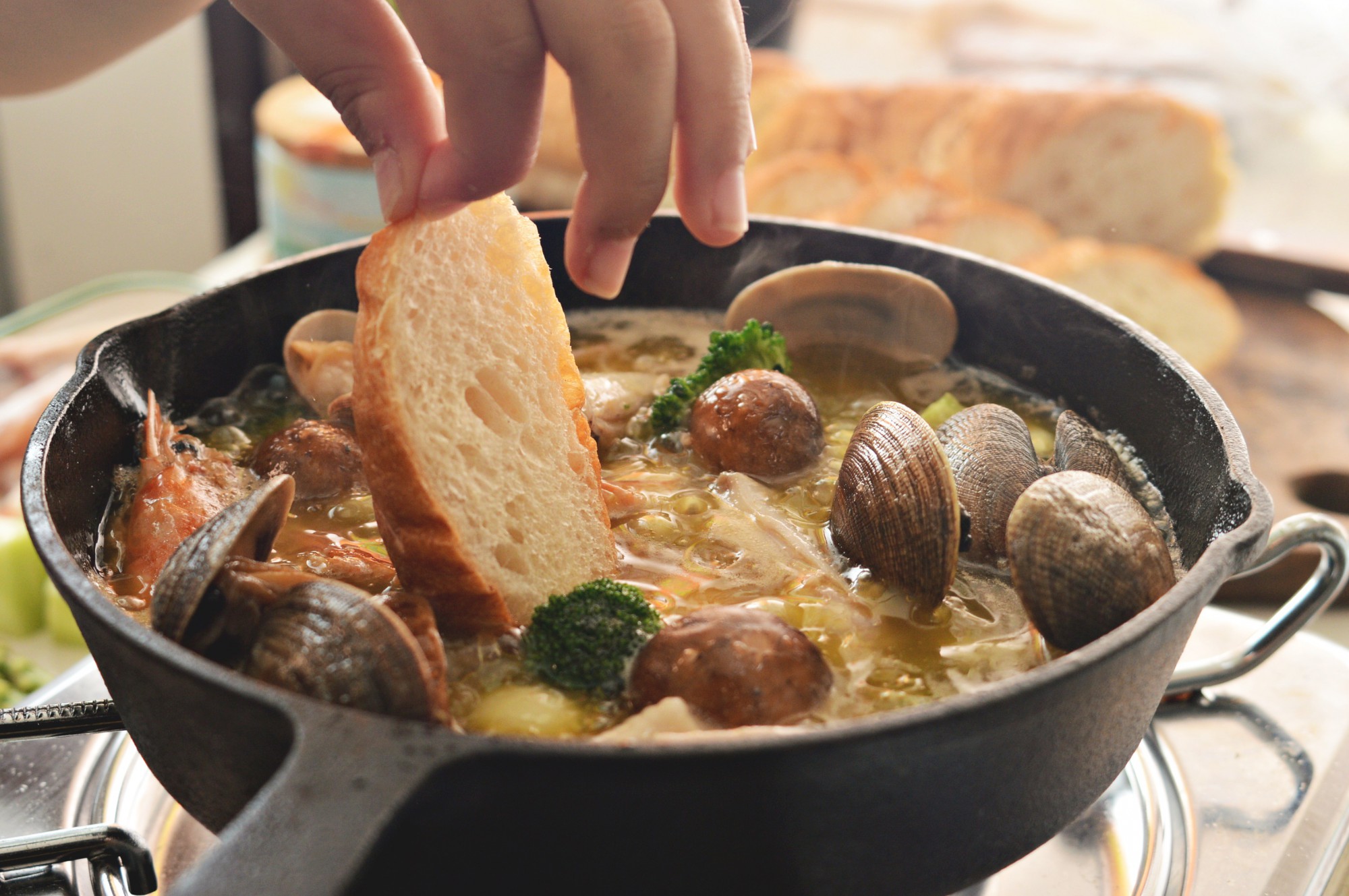 アヒージョ発祥の地である本場スペインでは、バゲットやチュロスを食材と一緒に食べたり、オイルに浸して食べたりするのが定番ですが、もちろん食パンなどお好みのパンでアレンジしてもOK。パンは焼き過ぎない方が、食材のうま味を含んだオイルをたっぷりと吸いやすいのでおすすめです。