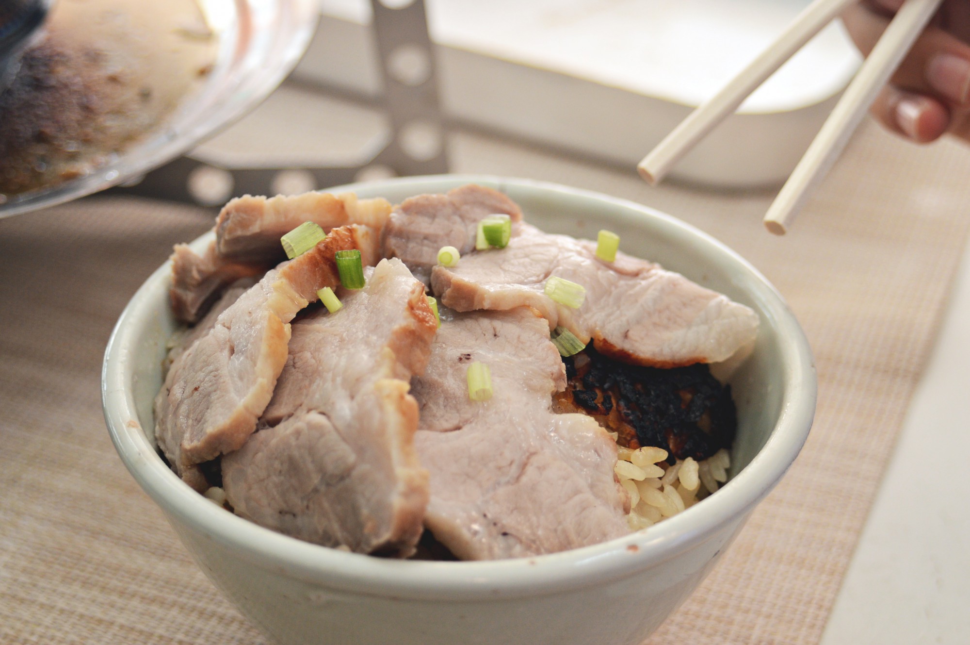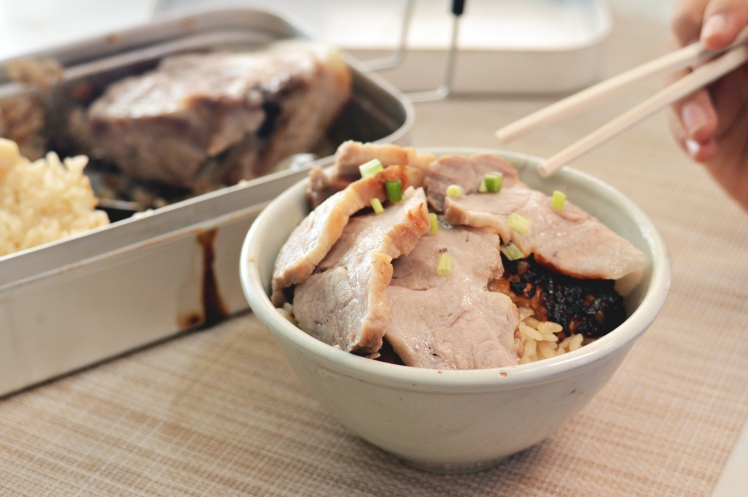 メスティンから豚肩ロースブロックを取り出し、食べやすい厚さにカットしていきます。炊いたご飯を器に盛り付け、チャーシューを乗せたらチャーシュー丼の完成です。