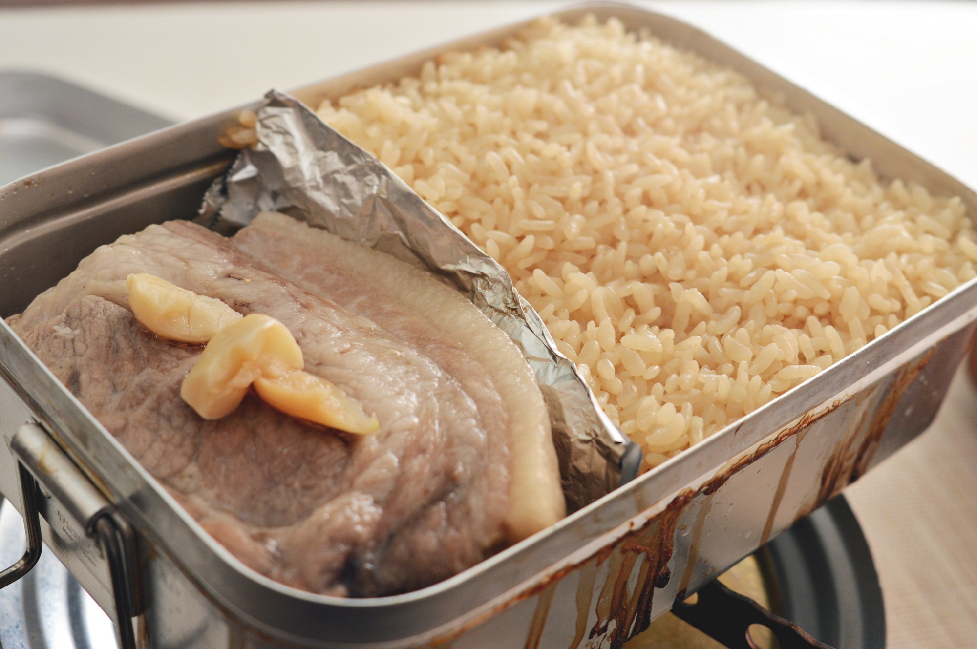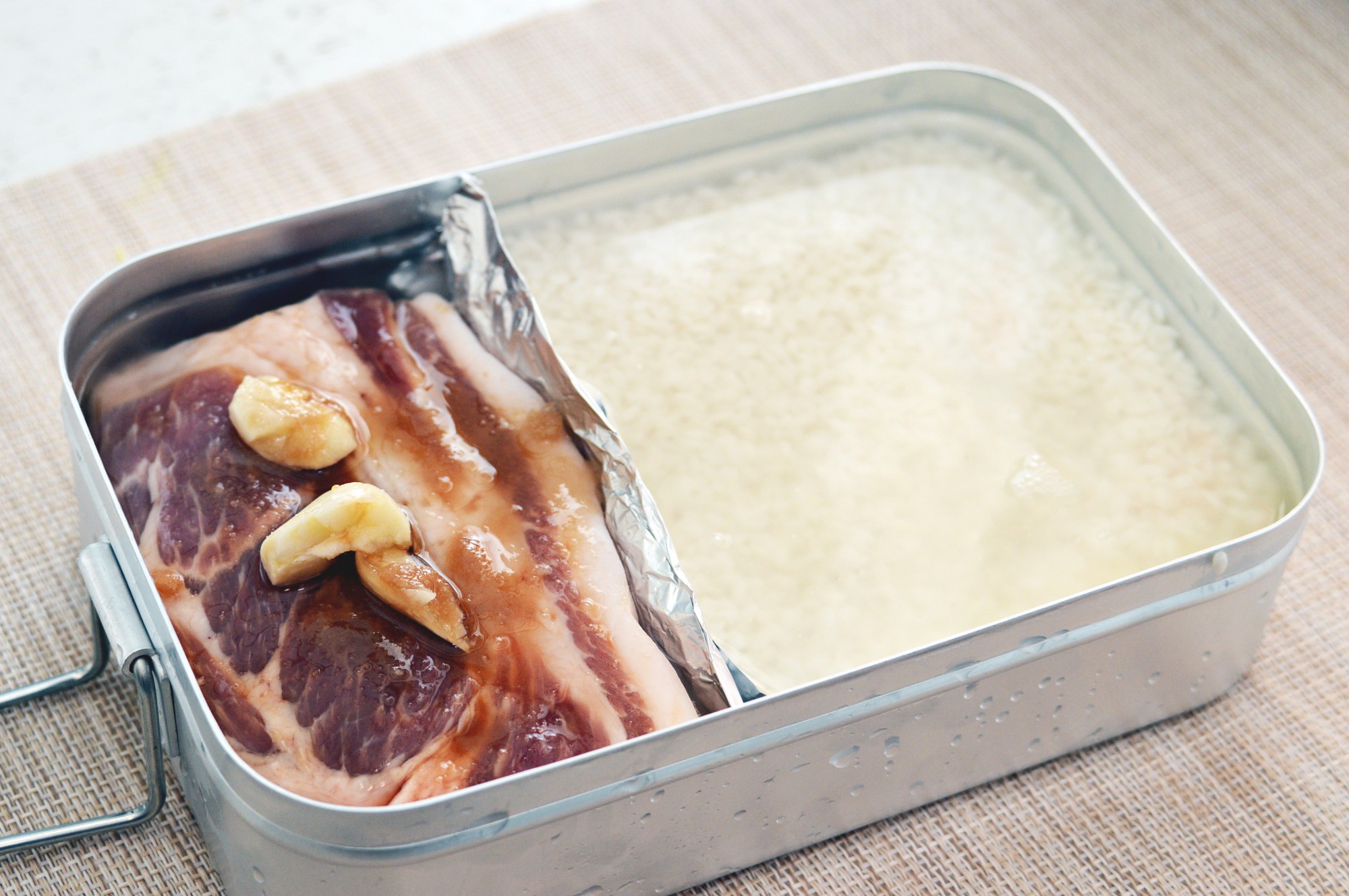 今回は、炊飯とチャーシュー作りを一台のメスティンで同時に調理していきます。やり方は簡単。米と下味をつけた豚肉ブロックをメスティンに収め、そのまま炊飯するだけ。