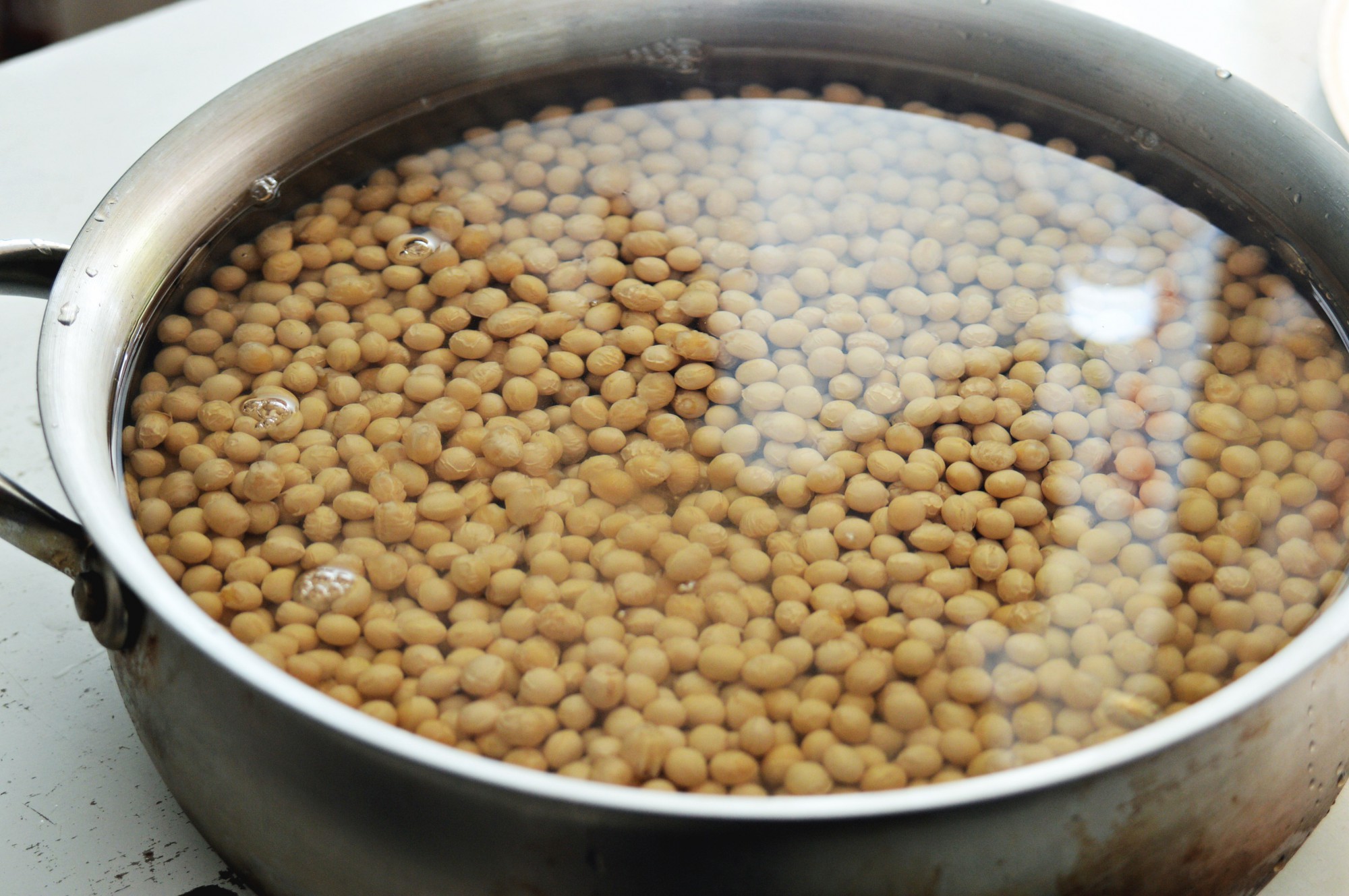 まずは乾燥大豆を戻す作業からです。大豆を擦り合わせながらよく洗ったら、大きめの鍋などに入れてたっぷりの水に浸けましょう。大豆を戻すのに必要な水の量は、大豆の3倍程度です。たまに大豆の様子を見ながら、水が不足しそうなら適宜足してあげてくださいね。
