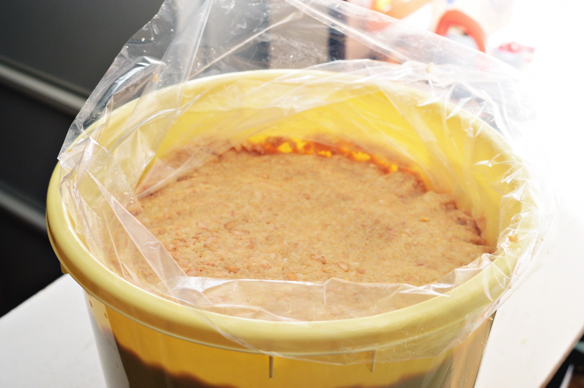 漬物樽に漬物袋をセットし、空気が入らないように気を付けながら味噌を詰めていきます。空気が入るとそこからカビが発生し、中から腐敗してしまう可能性があるからです。