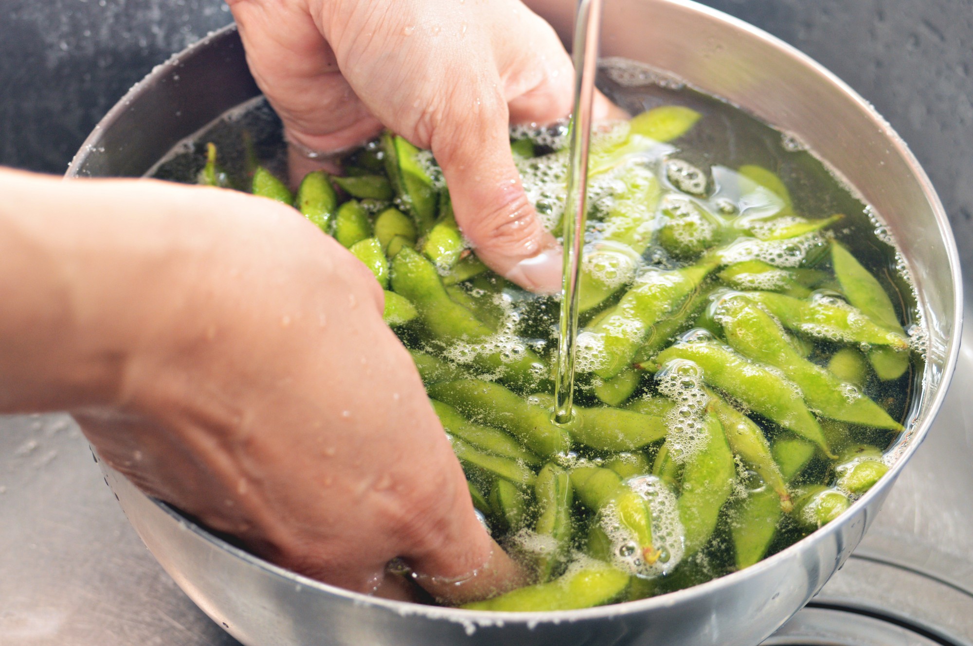 流水で塩や汚れをしっかりと洗い流しましょう。この後に枝豆を茹でるので、水気を拭き取る必要はありませんよ。