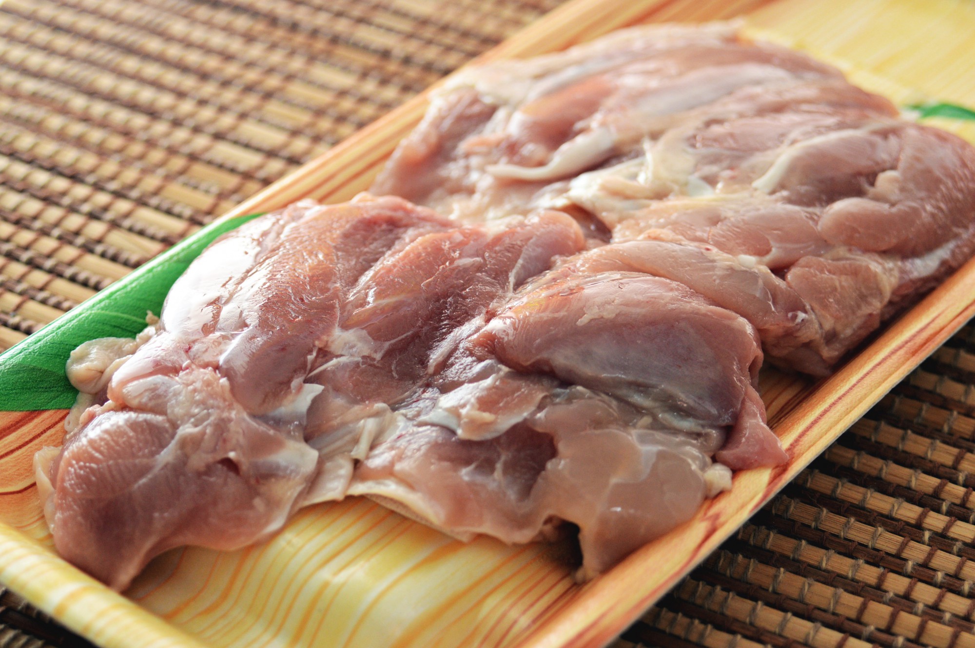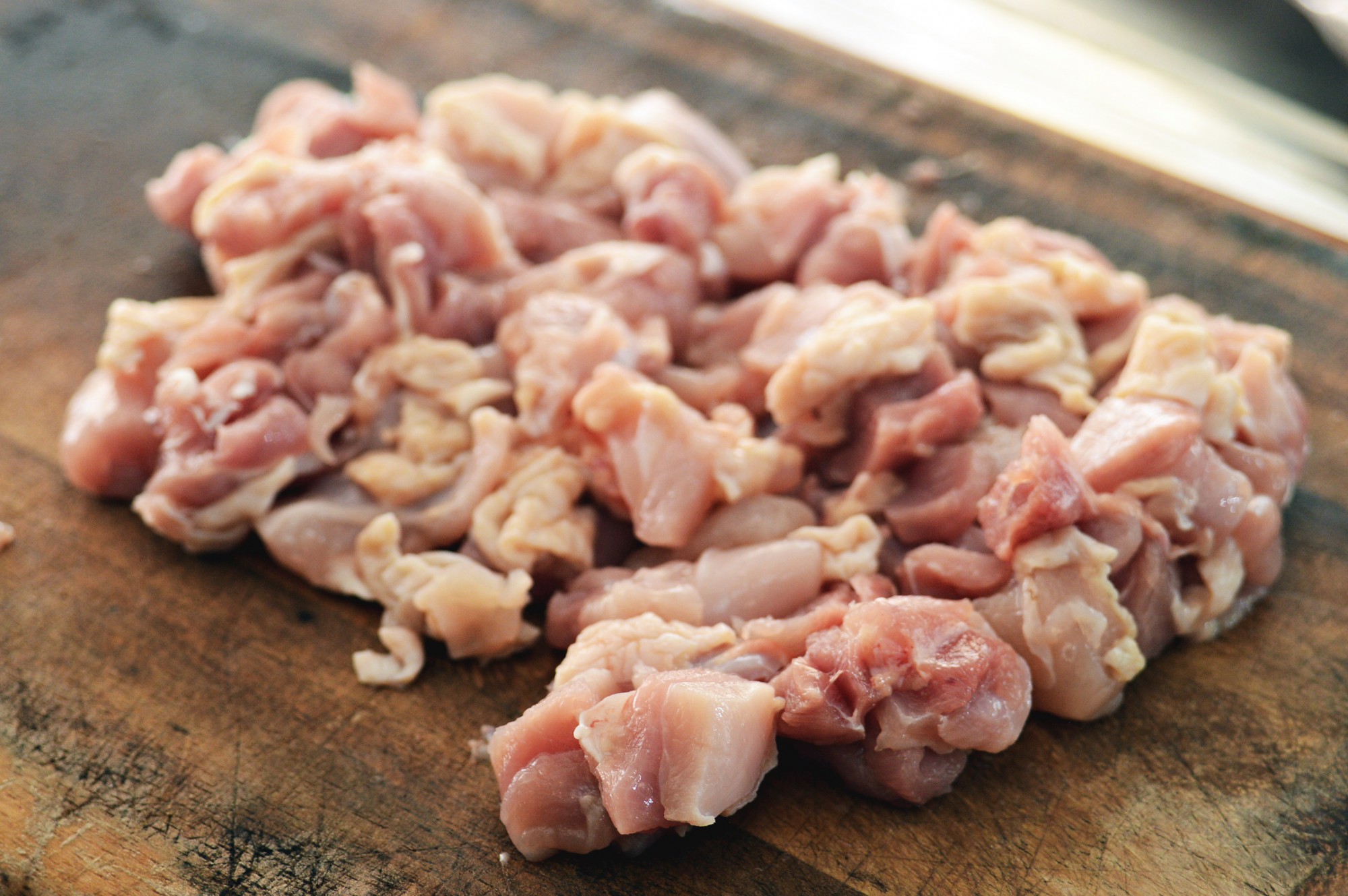 鶏もも肉を、小指の先ほどの大きさにカットしましょう。こちらも房総地どりや水郷赤鶏など、やはり地元の銘柄鶏を使いたいところ。近所のスーパーやお肉屋さんで、おいしそうな地鶏を探してみてください。