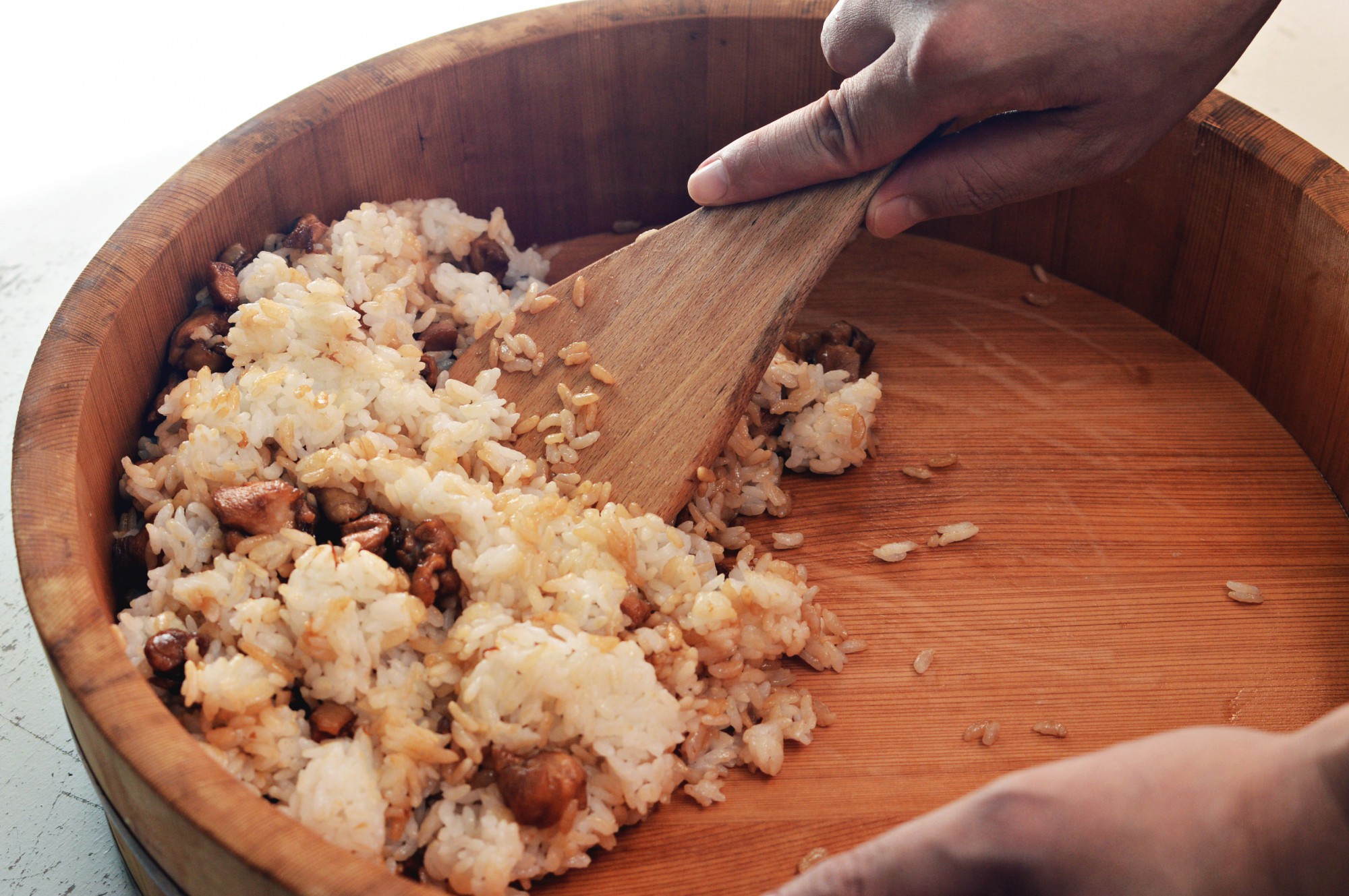 飯台やボウルなどを使い、鶏肉とご飯をしっかり混ぜましょう。この時、ご飯の粒をつぶしてしまわないように注意。ご飯を練るように混ぜてしまうと、ご飯のでんぷん質により粘り気が出てしまいます。寿司飯を混ぜる時のように、しゃもじでご飯を切るようにして混ぜてくださいね。