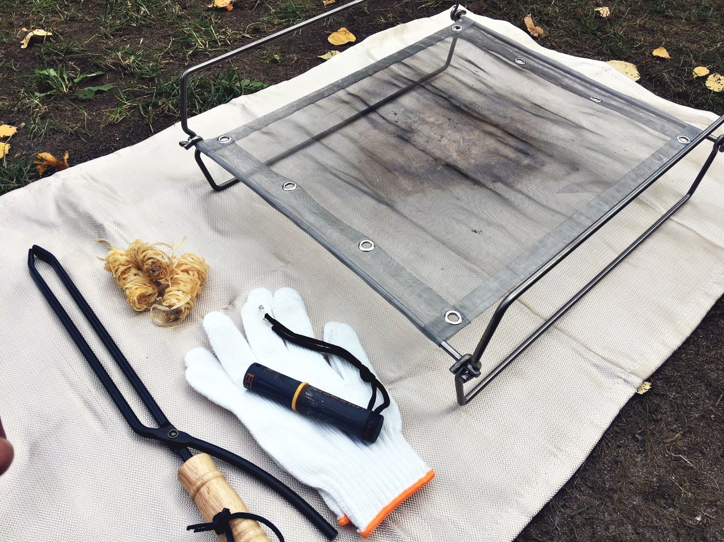 耐火シートや防火シートなどさまざまな呼び方がありますが、焚き火台から落ちる火の粉や火のついた木片、また焚き火台の熱などから地面を保護するための不燃性のシートです。焚き火台と併せて用意しておきたいアイテムです。