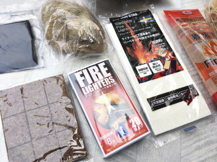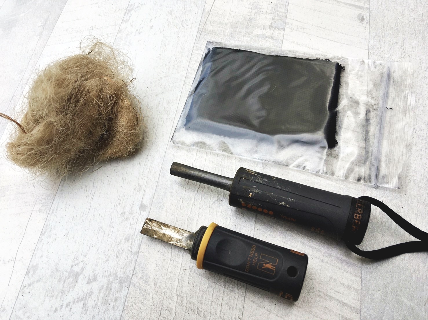 写真右下の2本の黒い棒状のものがファイアースターターです。上はロッドと呼ばれるもので、棒部分はマグネシウムなどを含む金属製です。下はストライカーと呼ばれる、ステンレス製の板です。
