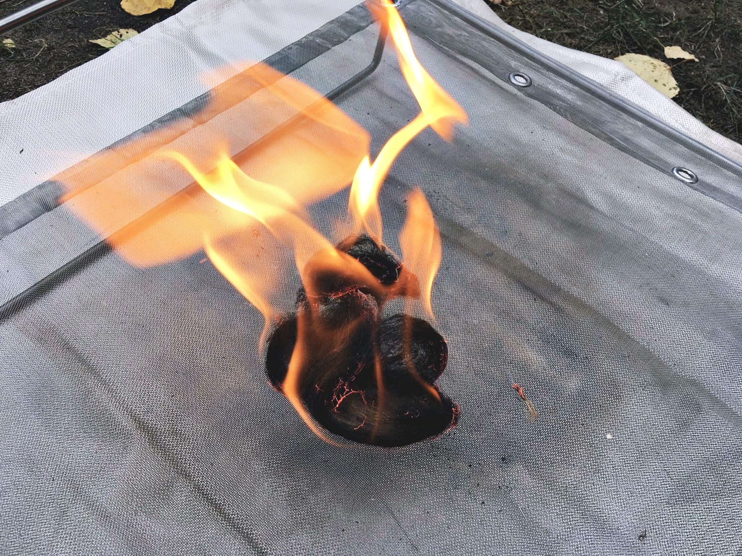 チャークロスは炭化した布で、簡単に言うと「布で作られた炭」です。ファイヤースターターの少しの火花でも容易に着火でき、しかも一気に燃え上がらず少しずつゆっくりと安定的に燃焼するので、安全かつ子どもにも扱いやすいのが特徴です。
