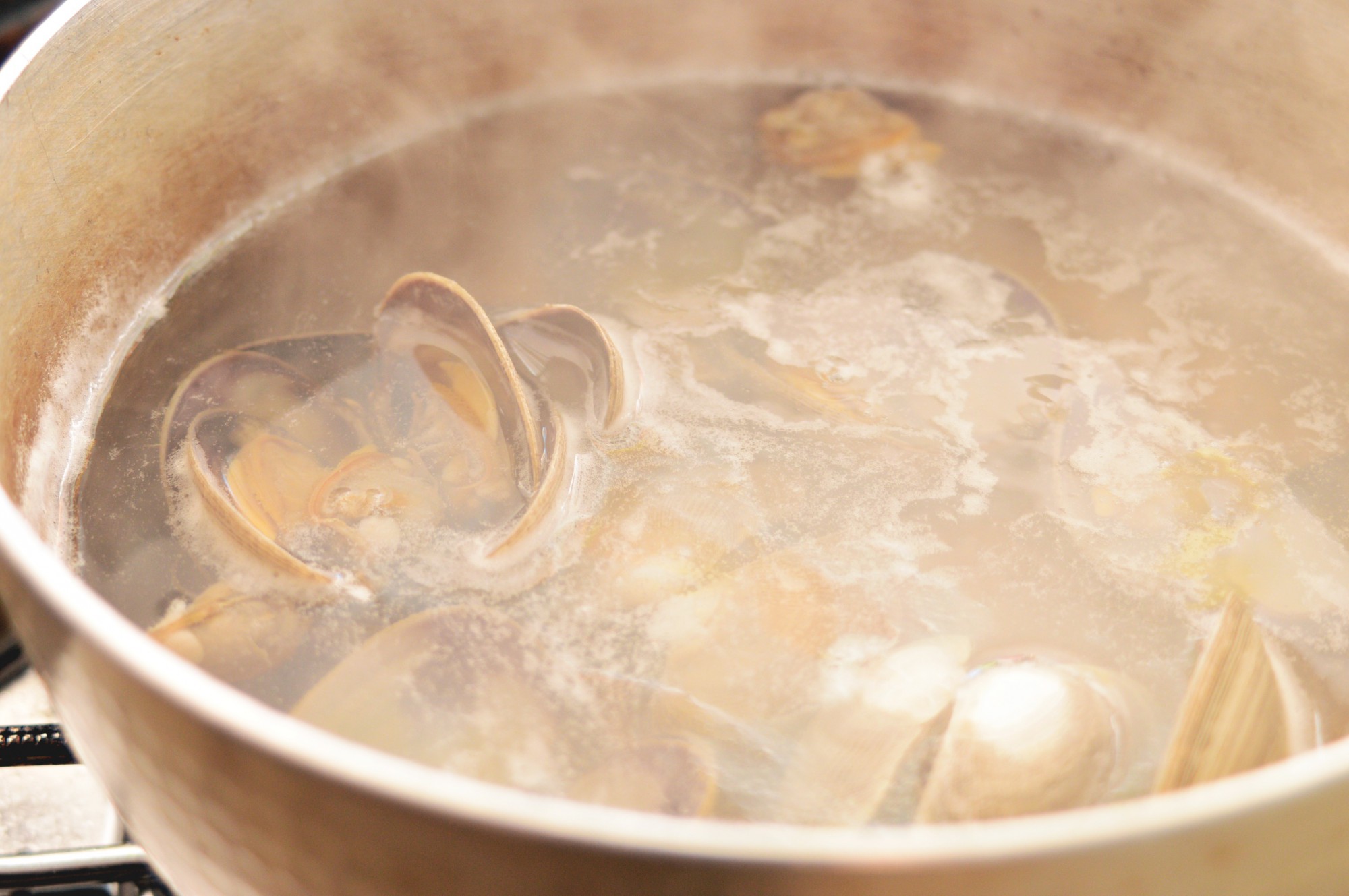 あさり出汁をとる際は、鍋を沸かし続けないのがポイントです。あさりに火が入りすぎると身が縮み、あさりの身のぷりっとした食感が損なわれてしまいます。