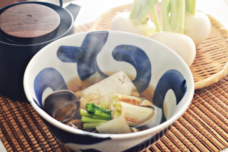潮雑煮は、あさりと昆布の出汁に塩としょうゆで味をつけ、かぶの甘い香りと焼いたねぎの香ばしさでまとめたお雑煮です。