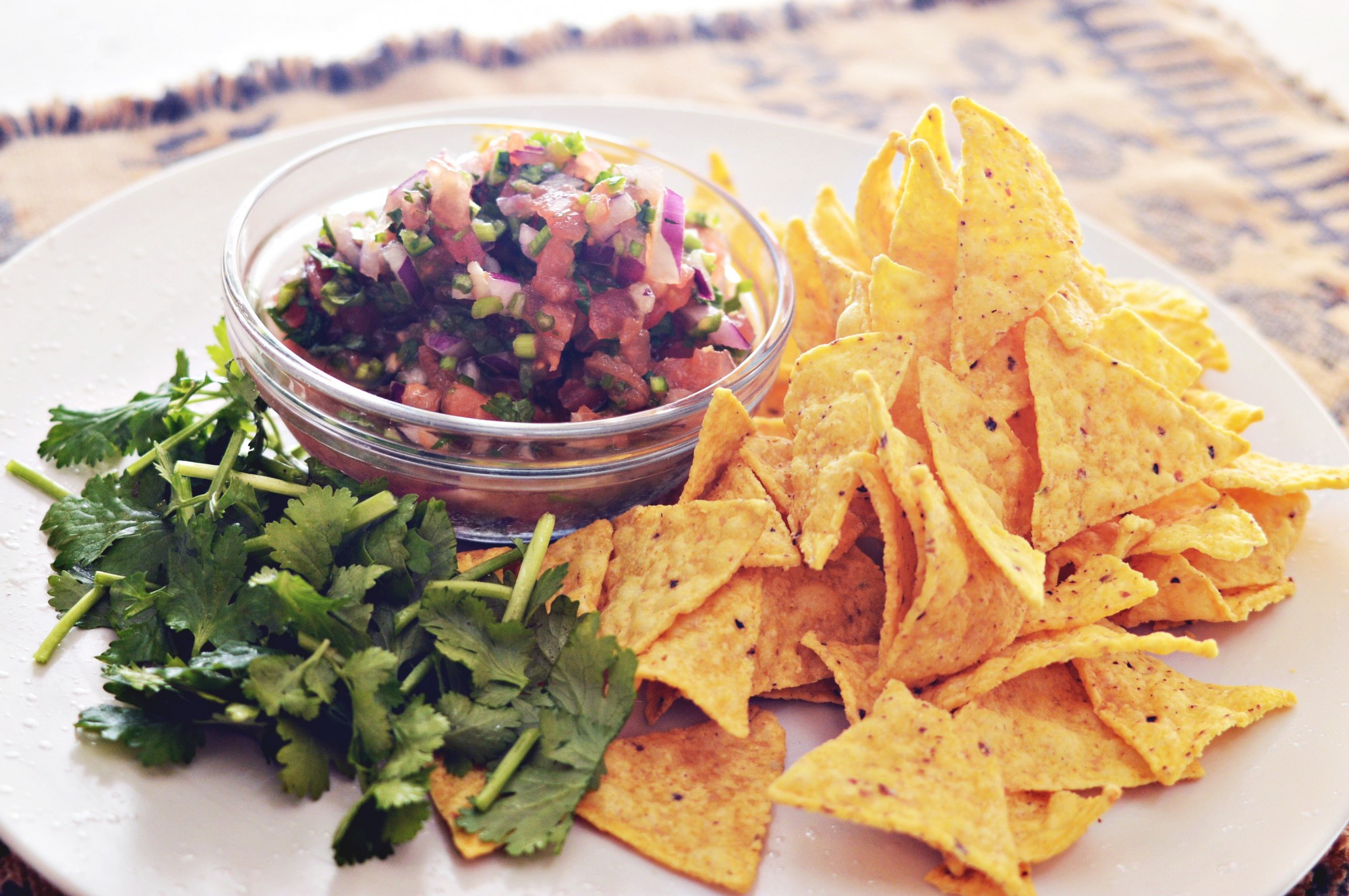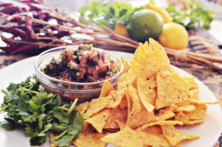 皿にトルティーヤ・チップスを盛り付け、サルサを添えるだけで立派な一品になります。食べやすく刻んだフレッシュパクチーなどを添えるといっそう本格的に。