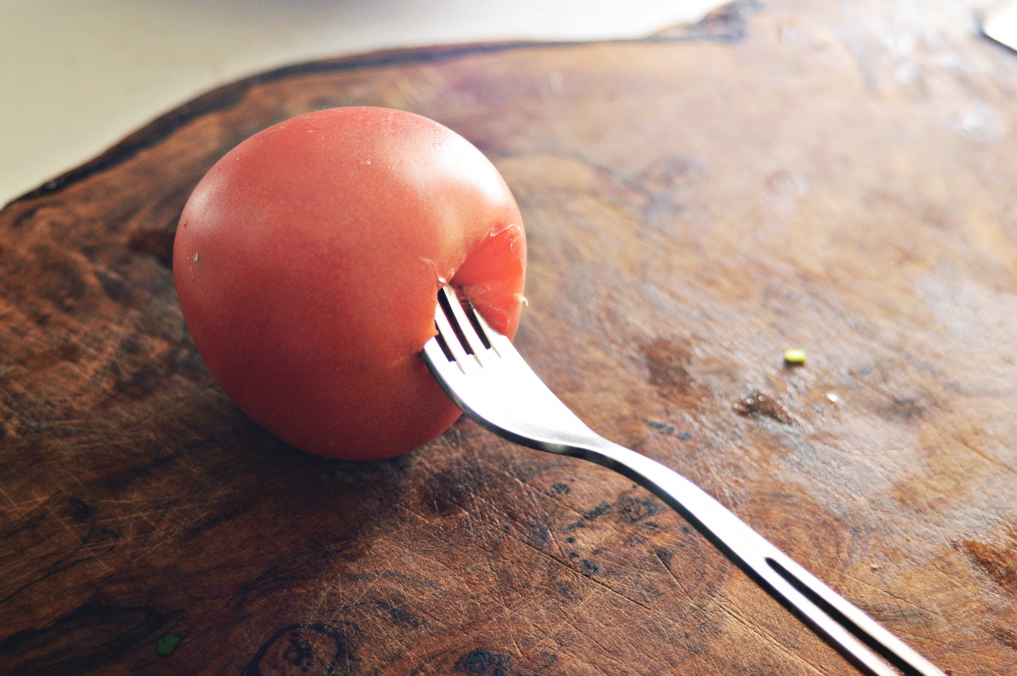 湯剥きする際は写真のように、トマトのヘタを取り除いてフォークを突き刺したまま、ガスコンロの直火で皮を炙ったり、沸騰した湯に浸けたりすると簡単です。