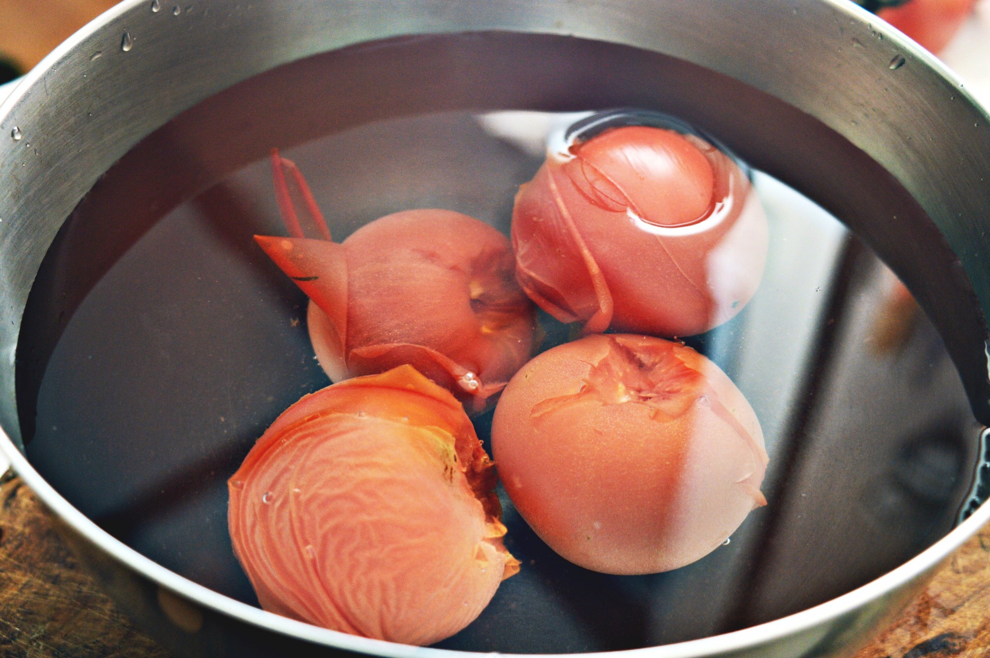 直火で炙ったり熱湯に浸けたりしていると、やがてトマトの皮が縮んで破けるので、そのタイミングで冷水に入れましょう。あとは手で簡単に皮が剥けますよ。
