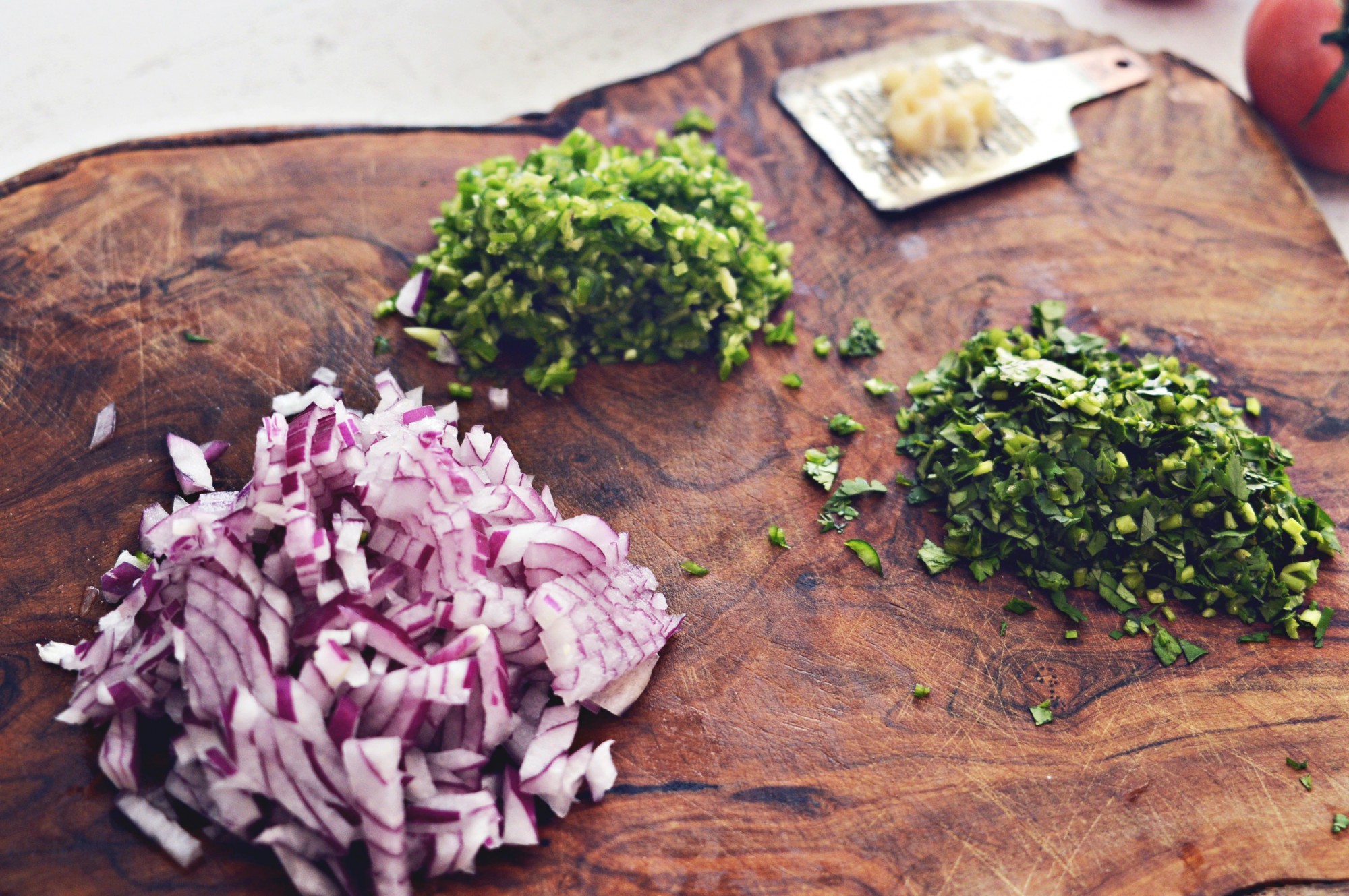 紫玉ねぎやパクチー、青唐辛子もみじん切りにしましょう。にんにくはすりおろします。