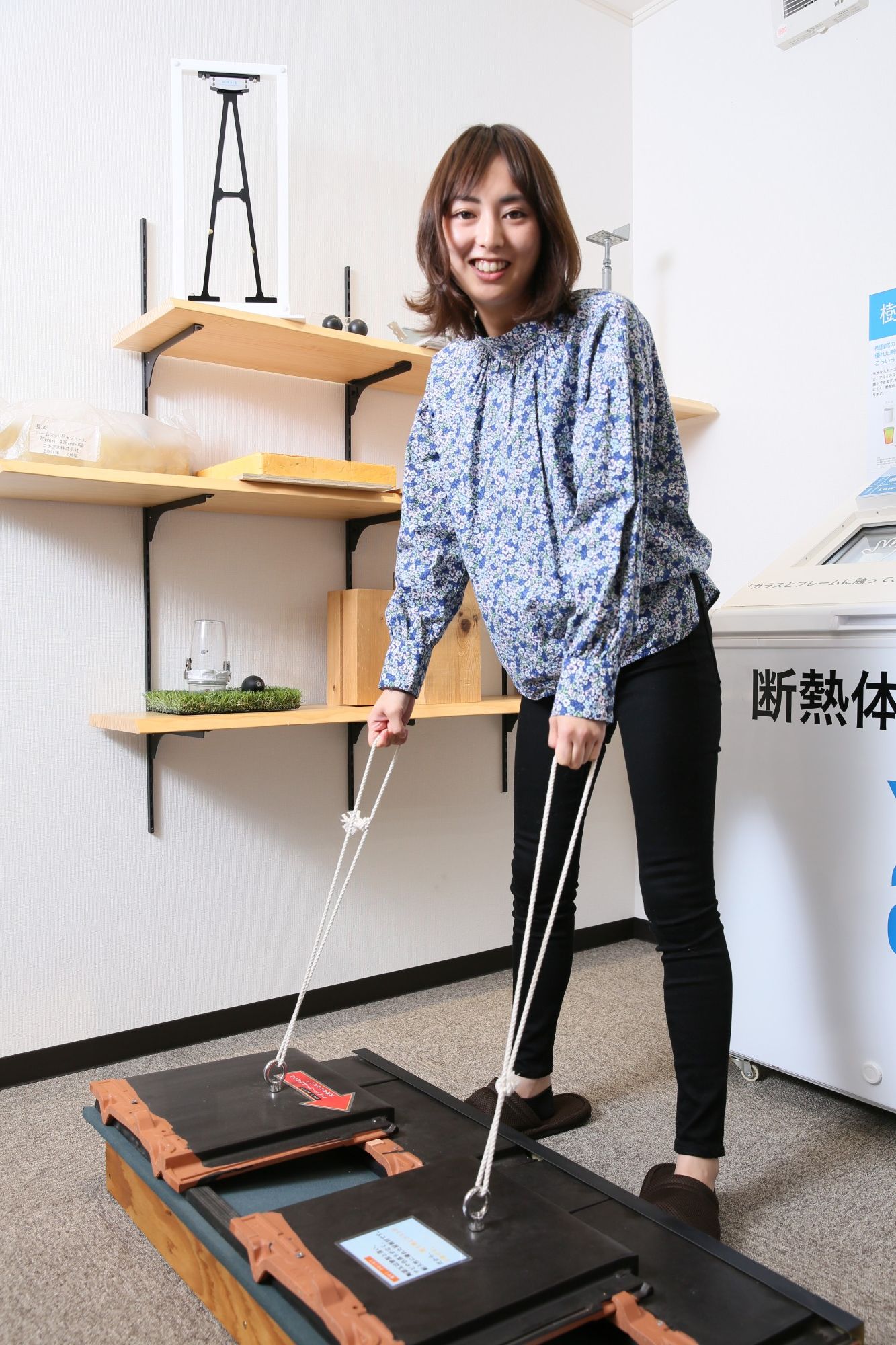 ▲思いっきり引っ張っても全然動かない!!取材後、ワールドハウス千葉展示場の体験コーナーで防災瓦と一般の瓦をひもで引っ張り、強風時の飛びにくさの違いを体感させていただきました。