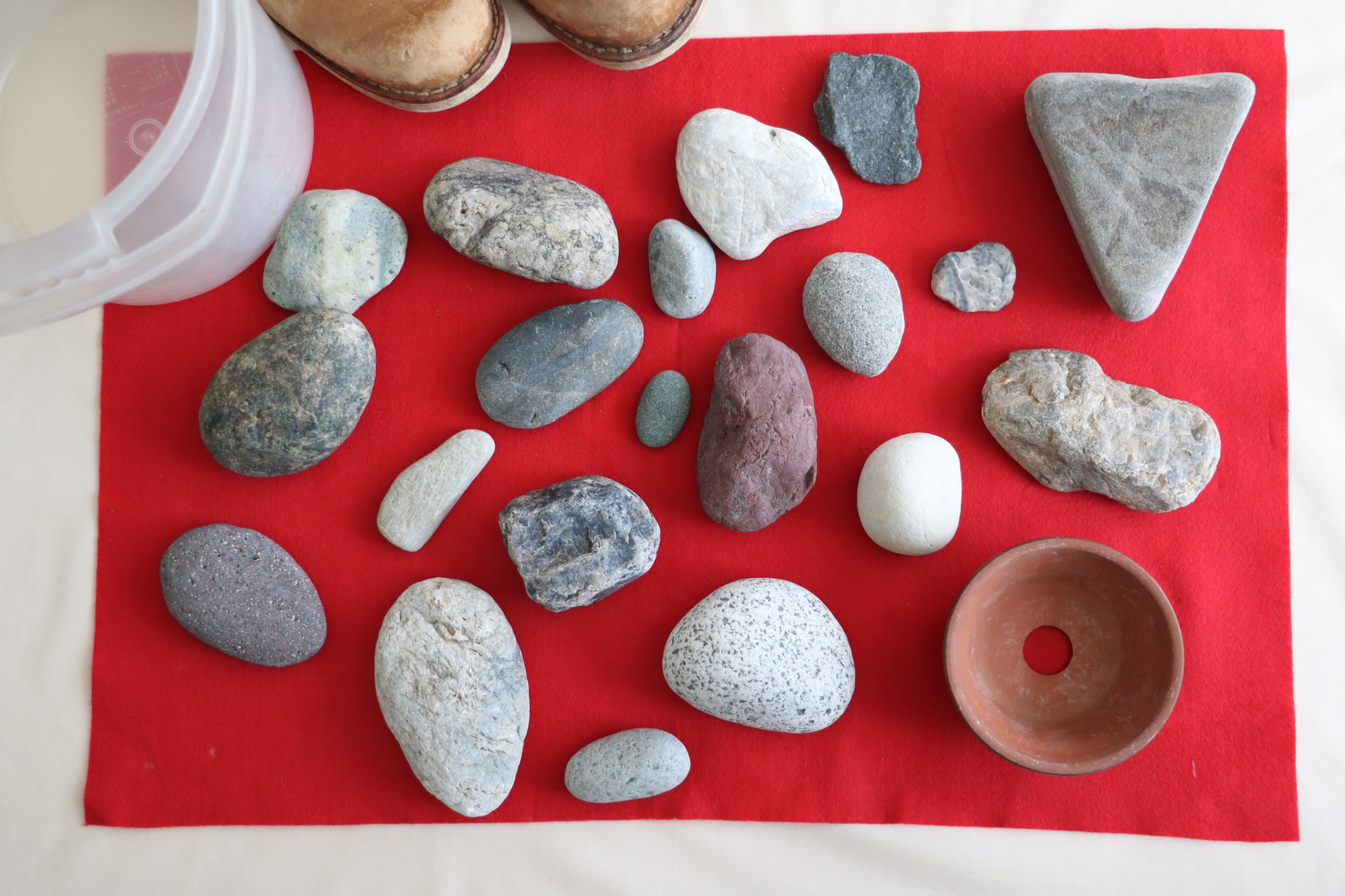 できれば手袋があると◎!石は重いので、運ぶにはプラスチックのバケツなどがあると便利です。本格的に探すときは、石を間違って落としてもケガをしにくいつま先の丈夫な靴を履いていると安心です。