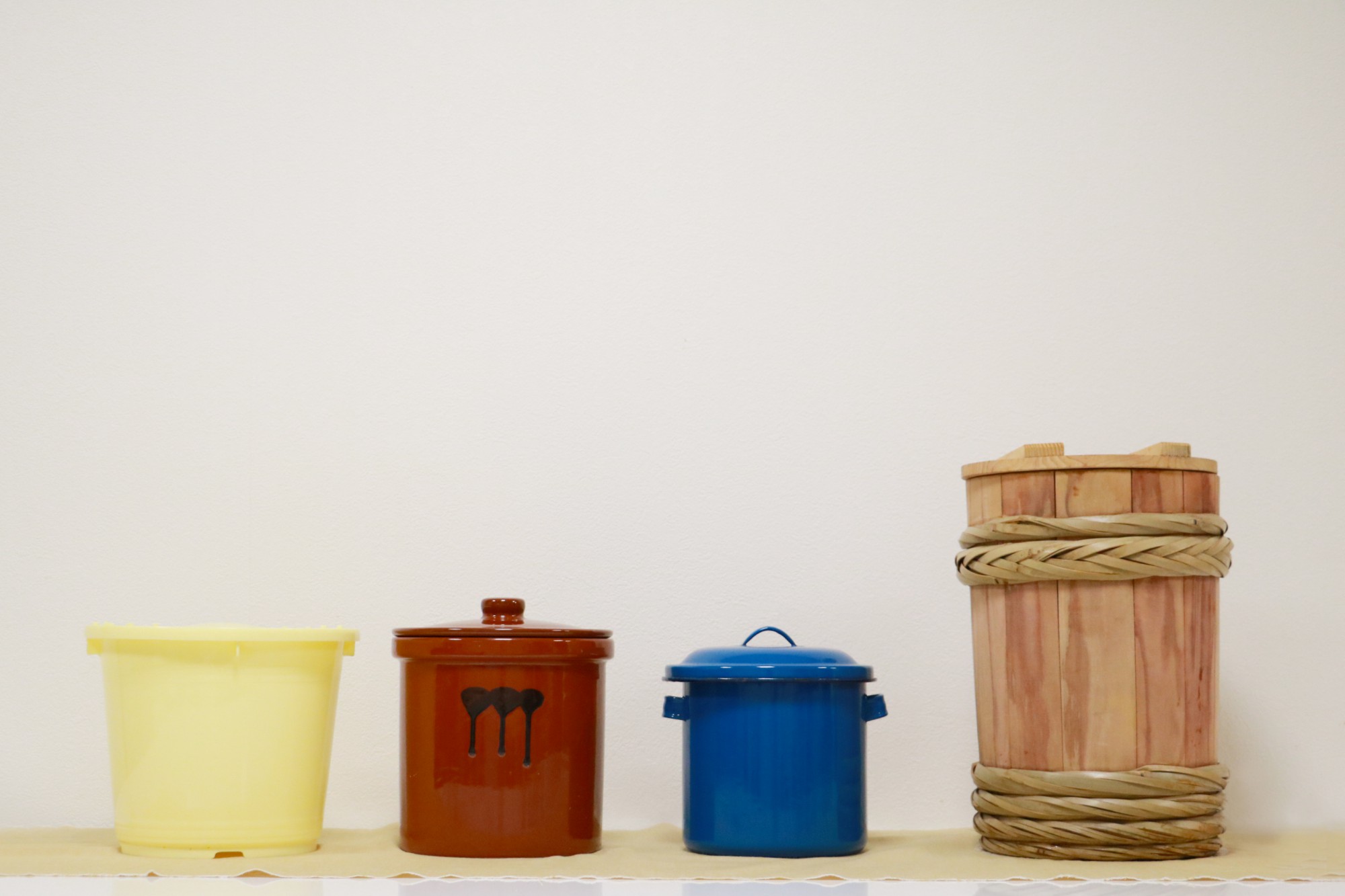 (左から、プラスチック容器、味噌かめ、ホーロー、木桶)